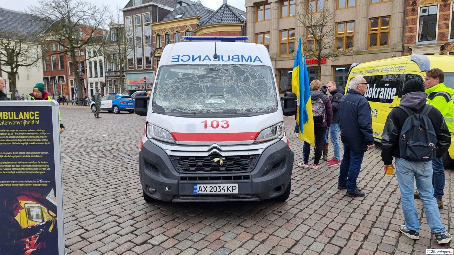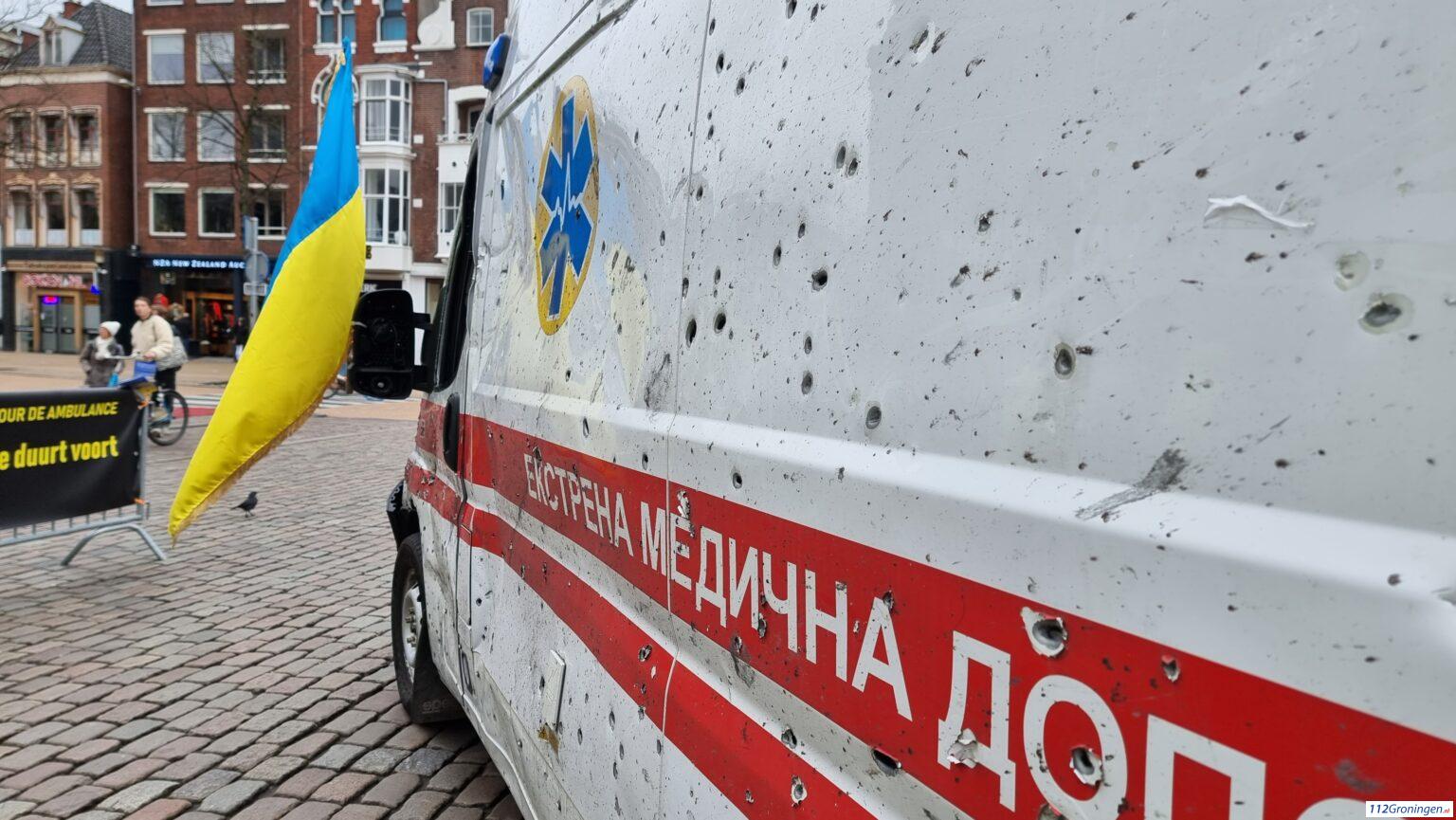 Groningen – Wie maandag over de Vismarkt loopt, waant zich een klein beetje in het oorlogsgebied in Oekraïne. Op het marktplein staat een kapotgeschoten ambulance uit de regio Charkiv, als symbool voor de verschrikkingen die artsen, reddingswerkers, eerstehulpverleners en burgers doorstaan.