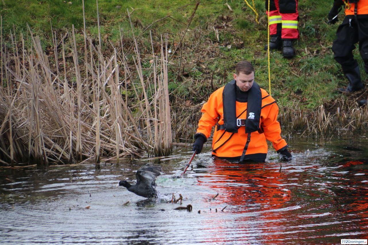 Ter plaatse bleek een meerkoet vast te zitten in visdraad. Brandweermannen met een waadpak schoten te hulp en hebben het dier bevrijdt van het draad.
