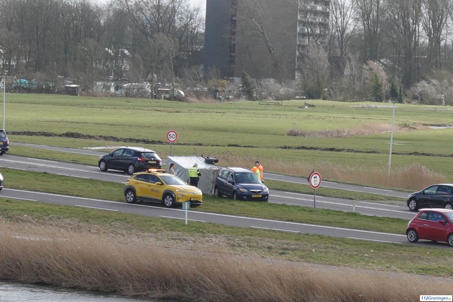 Groningen – Op de Friesestraatweg N355 ter hoogte van de wijk Reitdiep is een aanhanger omgewaaid achter een auto. Vermoedelijk komt dit door de harde wind.