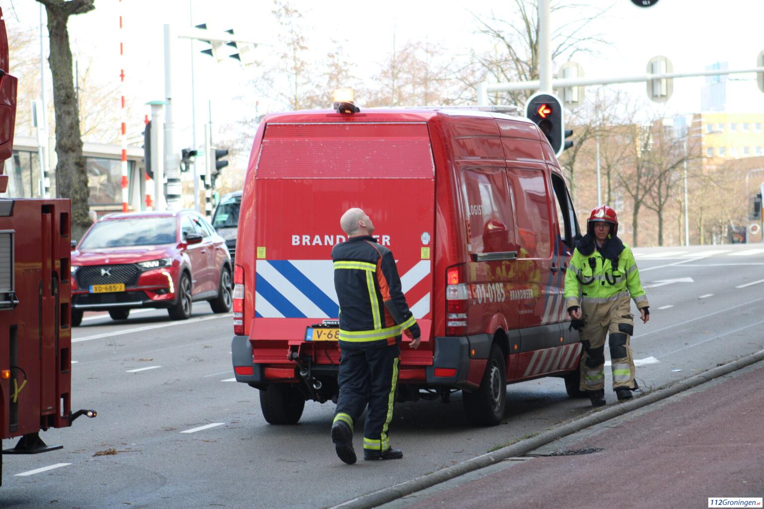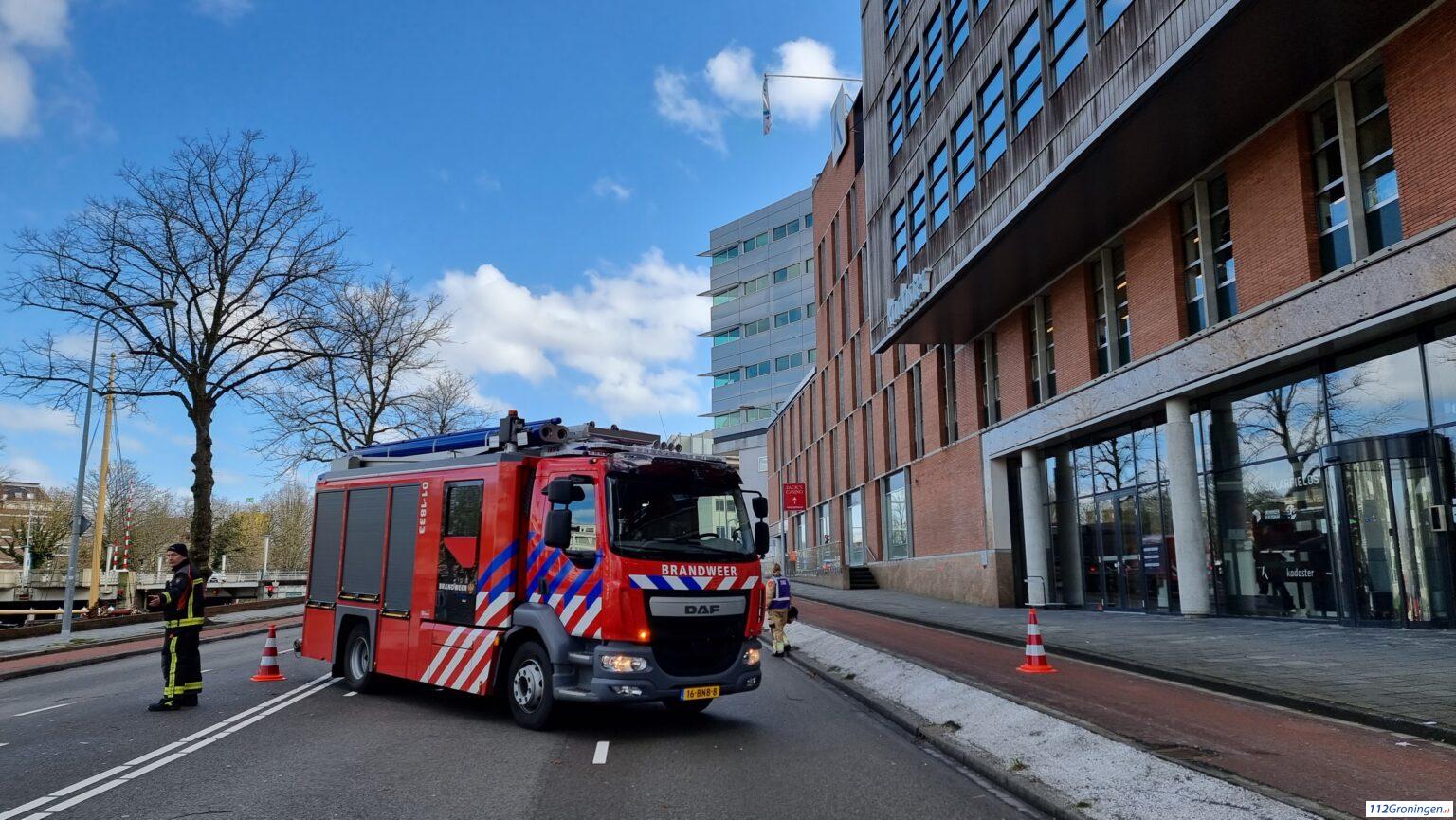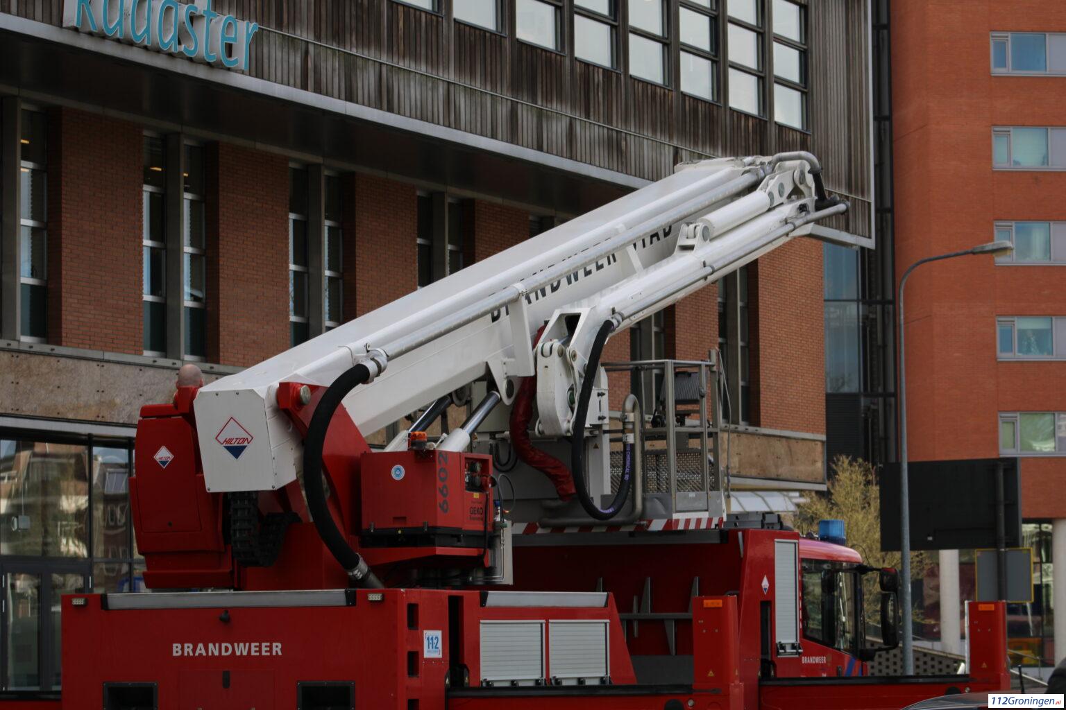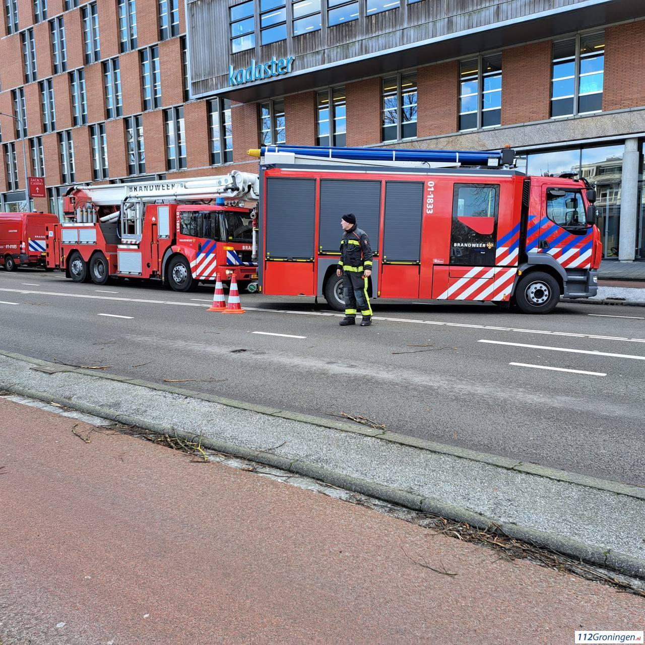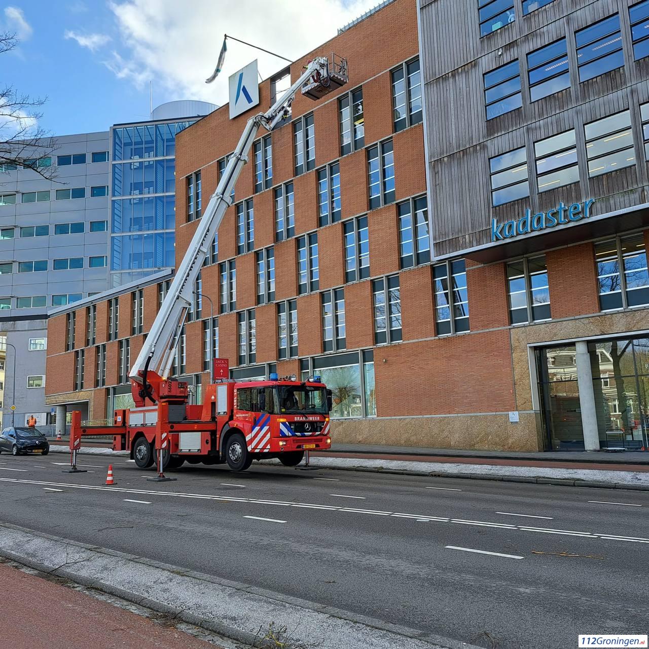 Groningen – Bij het gebouw van Kadaster aan het Emmasingel is op het dak een vlaggenmast afgebroken door de wind. De hangt deels boven de Emmasingel. De brandweer is ter plaatse om de vlaggenmast weg te halen.