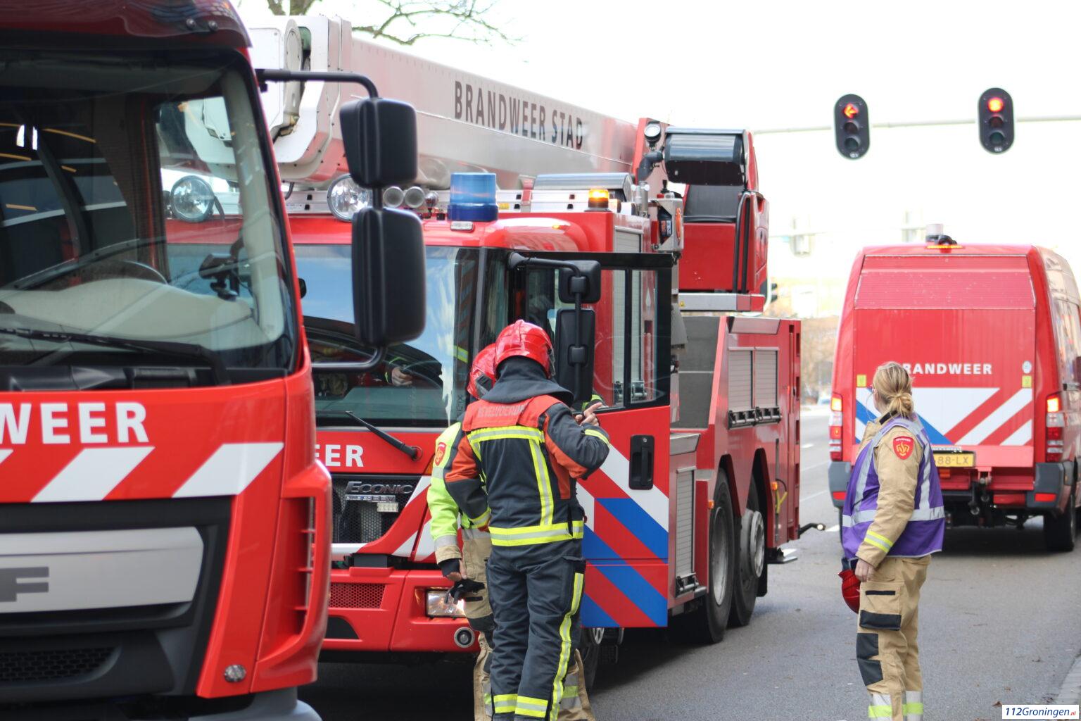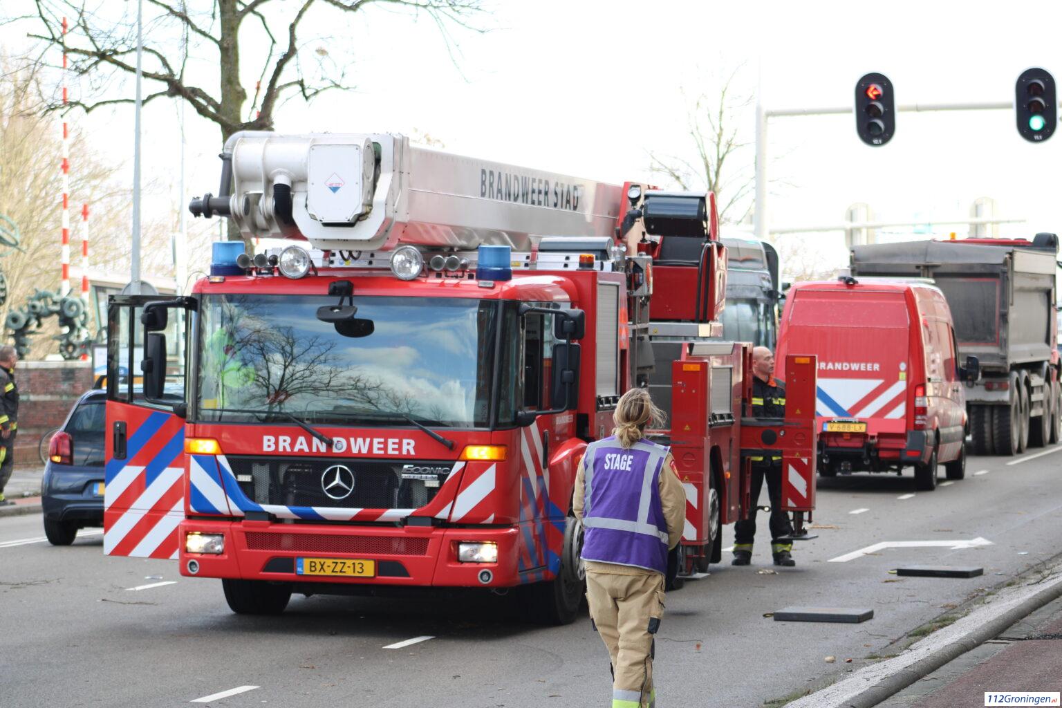 Een logistieke wagen van de brandweer die toevallig langs rees assisteert ook even. De weg is deels afgesloten inmiddels totdat het gevaar is geweken.