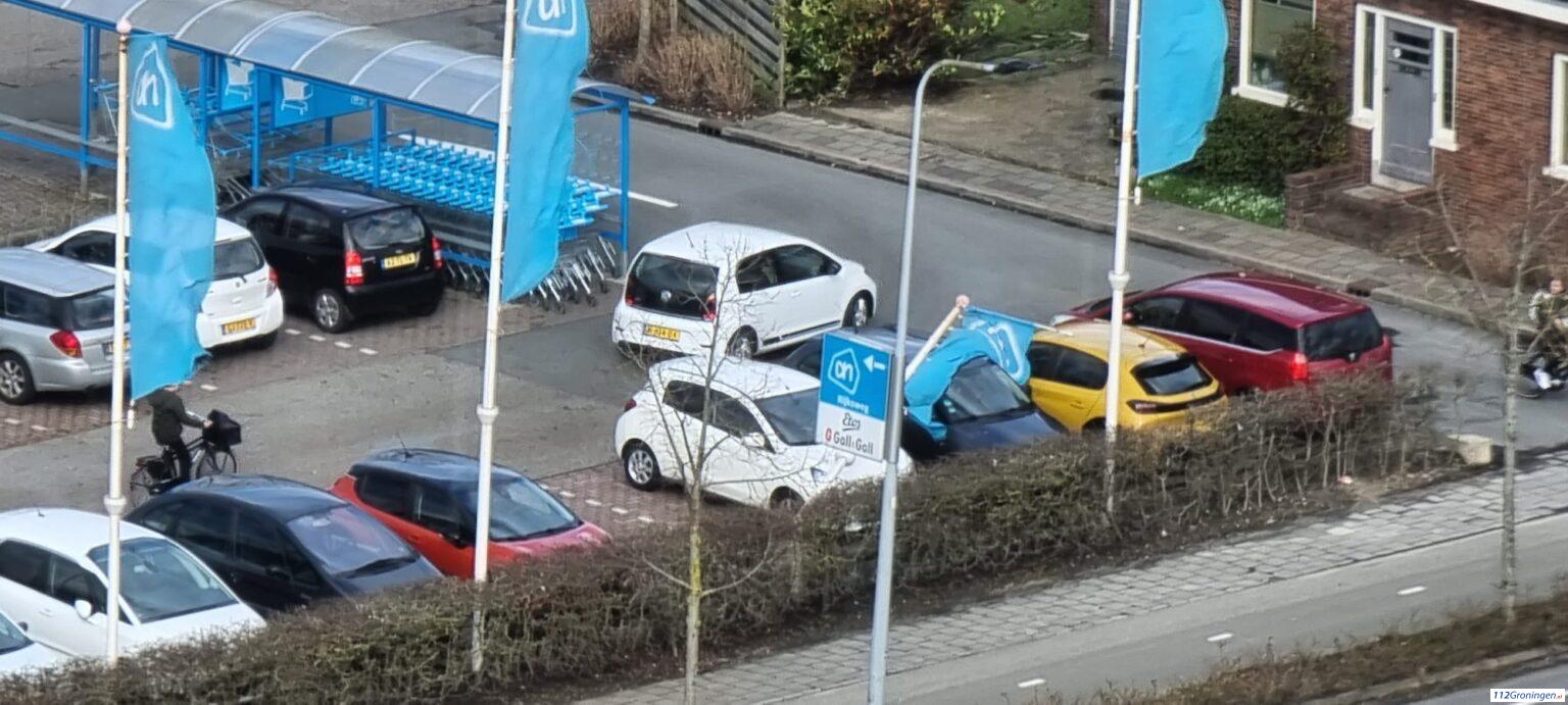 Bij de Rijksweg is bij Albert Heijn een vlaggenmast omgevallen over twee auto`s.