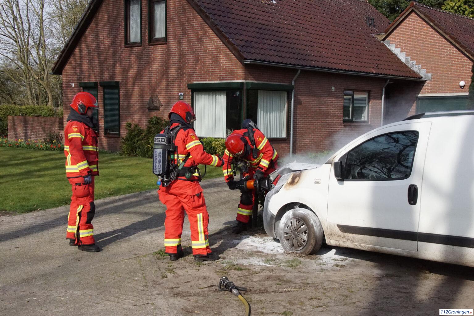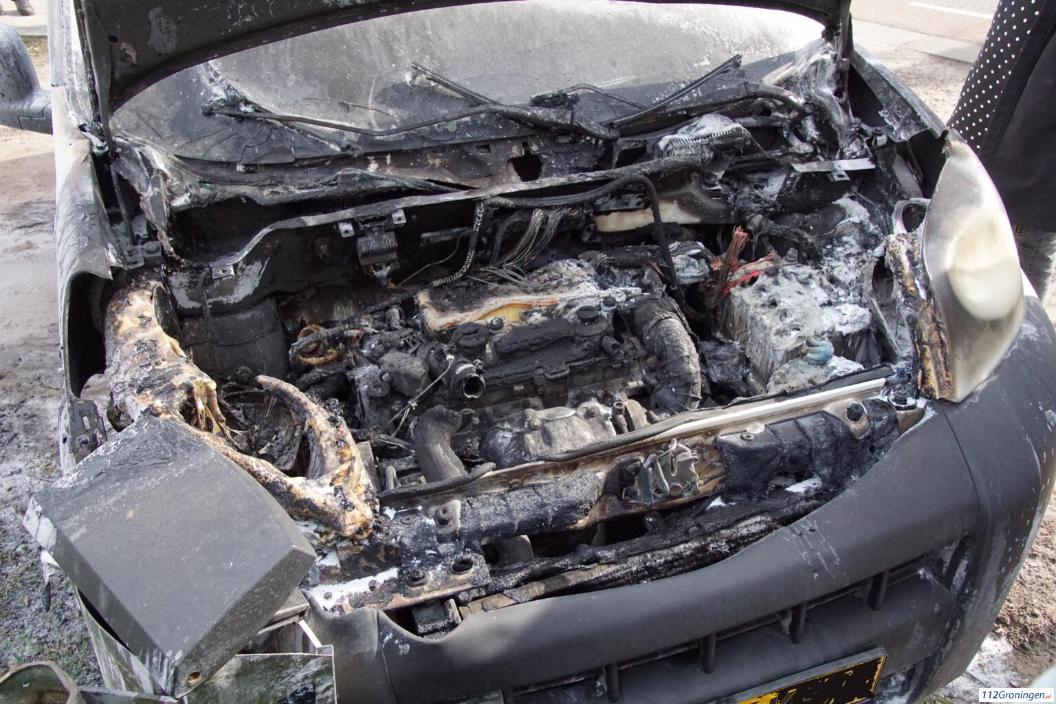De auto is grotendeels door buurtbewoners geblust maar toch zwaar beschadigd door de brand.
