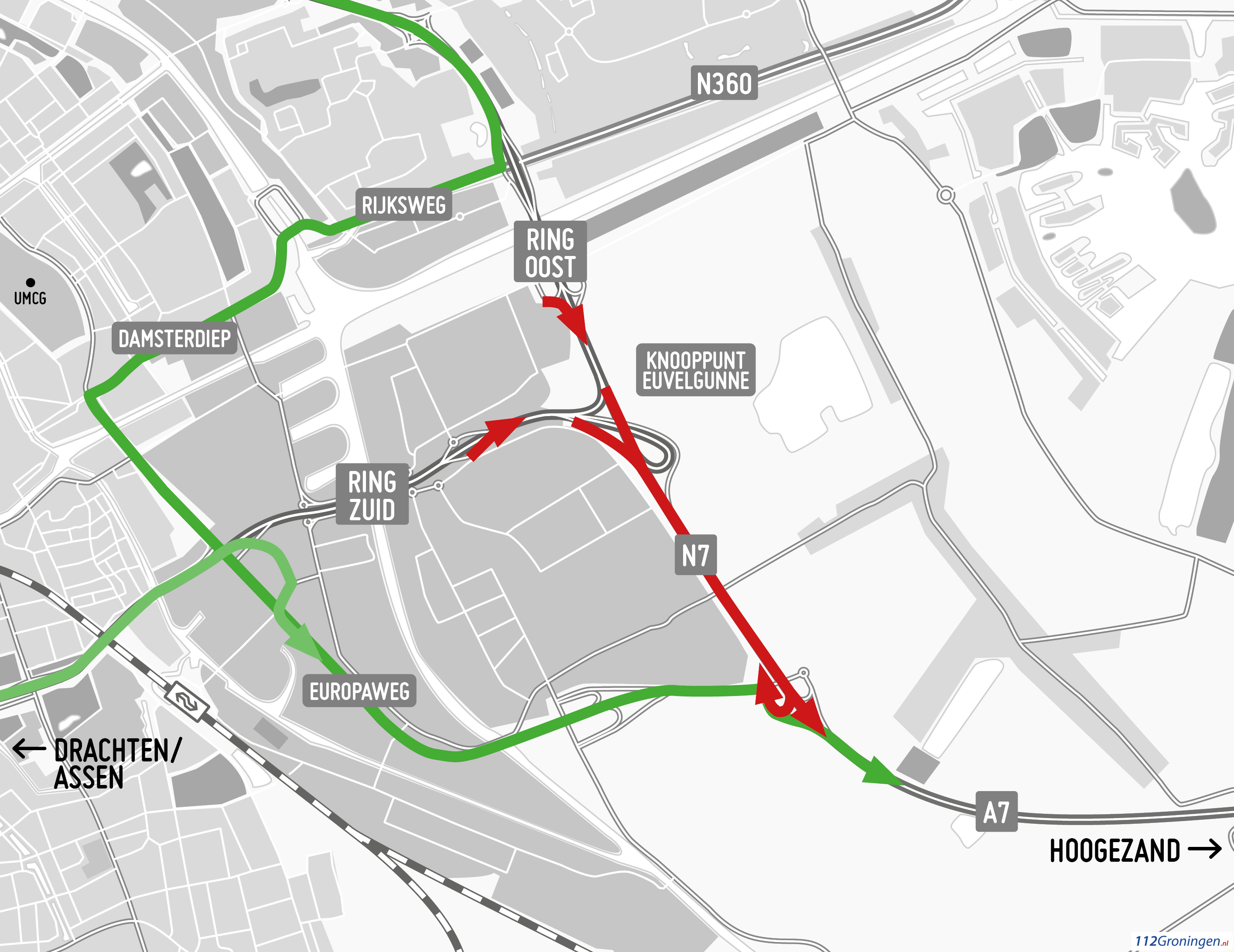 Verkeer uit de richting Drachten of Assen dat naar Hoogezand gaat, kan vanaf Ring Zuid omrijden via de afrit 37 bij de Europaweg en via deze weg naar Westerbroek naar de A7. Kom je vanaf de oostelijke ringweg (N46) dan kan je afrit 2 Delfzijl nemen naar de Rijksweg en het Damsterdiep en dan via de Europaweg naar Westerbroek en de A7.
