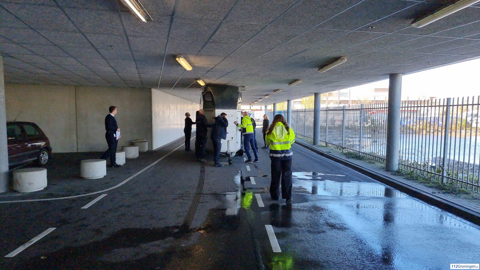 Groningen – Onder de IKEA is woensdagmiddag een auto met een te hoge paardentrailer vast komen te zitten. De aanhanger heeft daarbij ook een sprinkler geactiveerd.