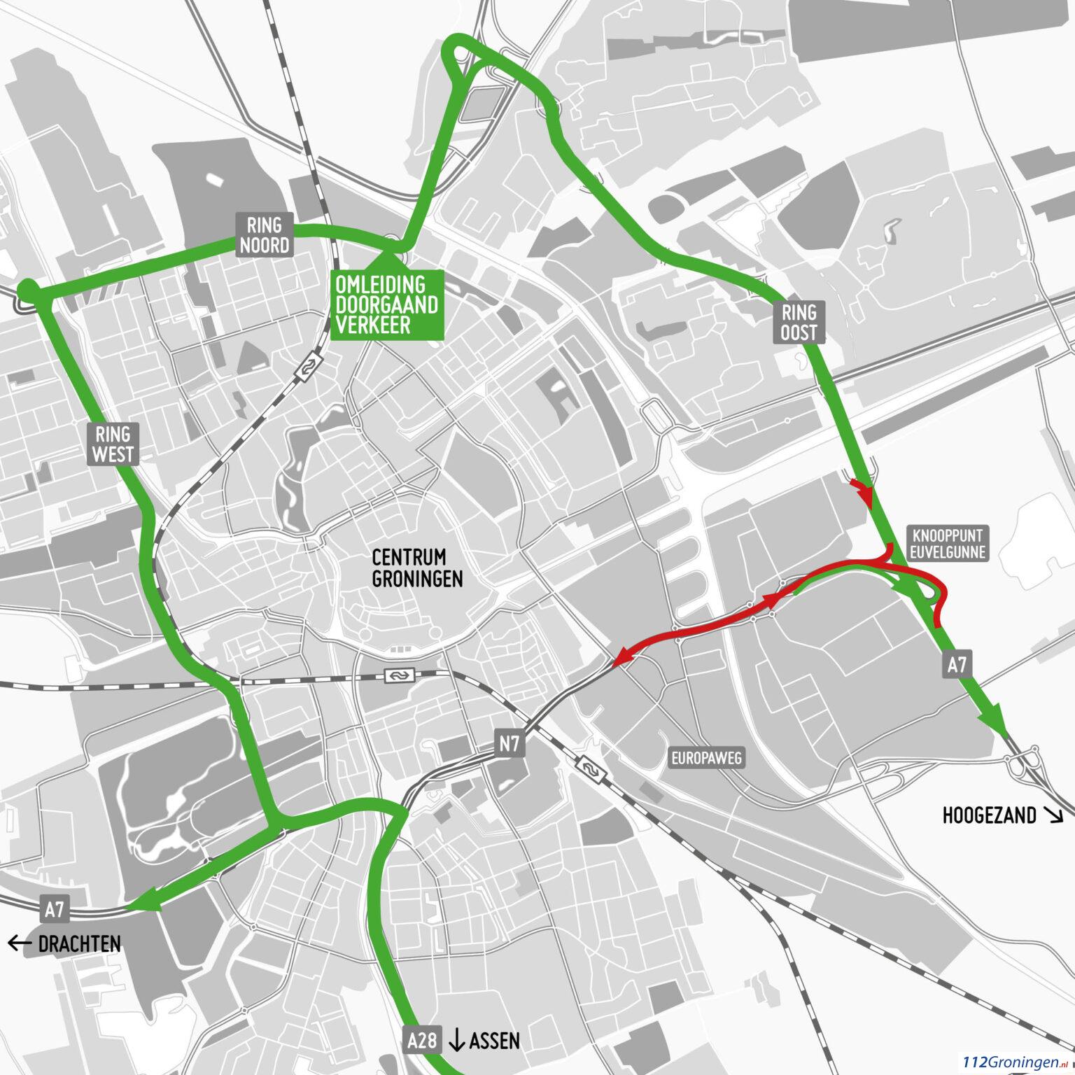 Groningen – Vanaf dinsdag 25 april 22.00 uur tot maandag 1 mei 06.00 uur is een deel van de zuidelijke ringweg (N7) in beide richtingen dicht. Het gaat om het gedeelte tussen de Europaweg en knooppunt Euvelgunne. Verkeer kan wel vanaf de toerit Zuid-Oost (38) richting knooppunt Euvelgunne rijden.