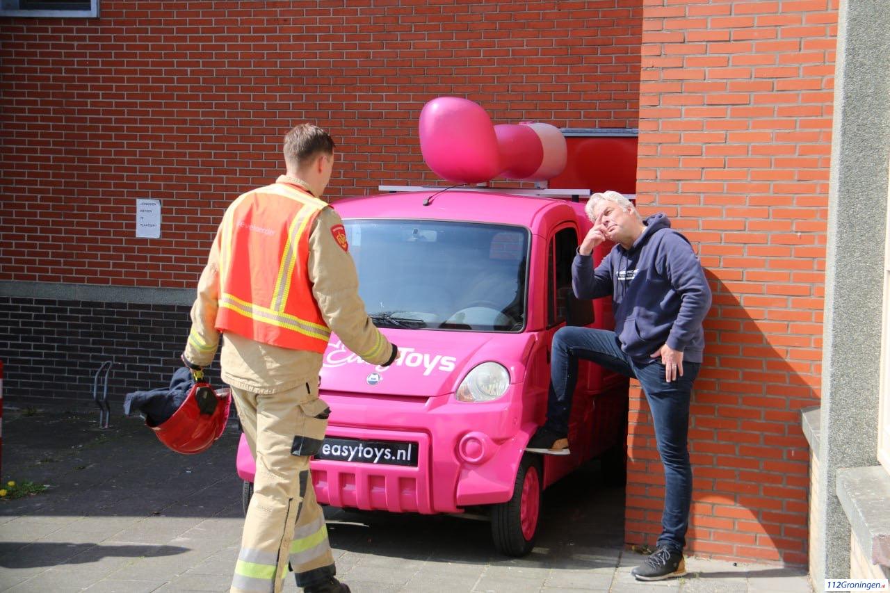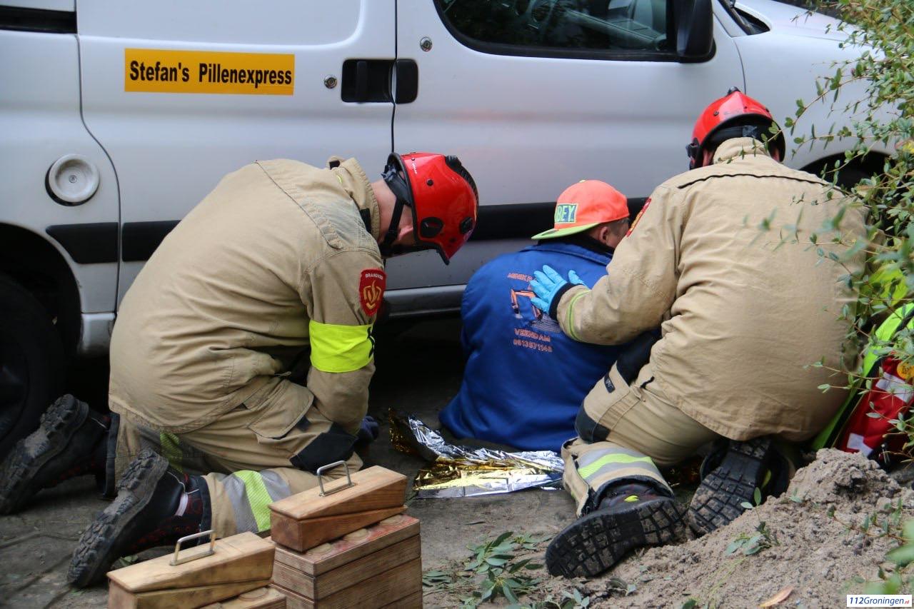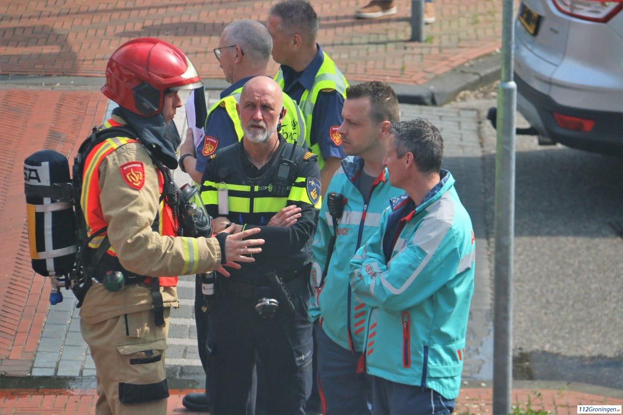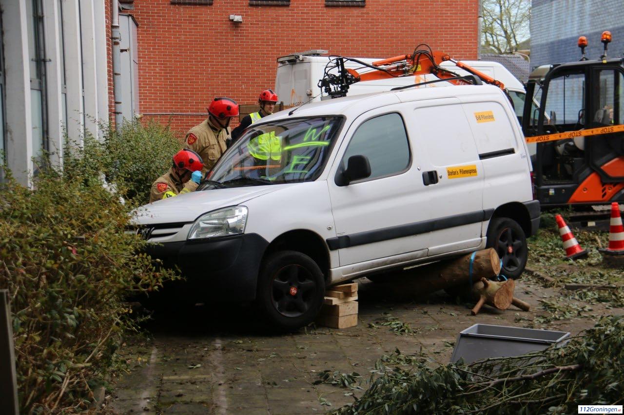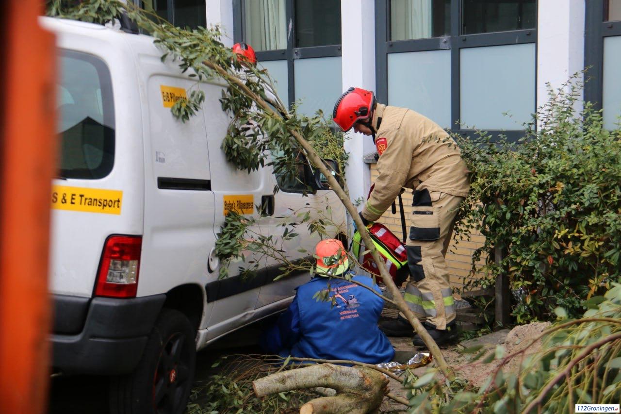 Op het schoolplein was een hoveniersbedrijf bezig met snoeiwerkzaamheden. Tijdens deze werkzaamheden komt een auto aangereden en deze rijdt over een boomstam (bestuurster zat te bellen) en raakt uit koers. Hierbij komt de auto tegen de gevel tot stilstand en een hovenier raakt bekneld met haar been onder de voorzijde van de auto. Een tweede hovenier ziet dit gebeuren en belt 112, hij staat de brandweer op te wachten.