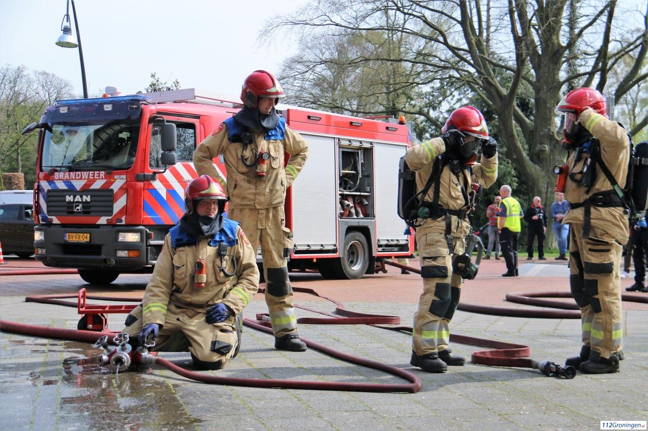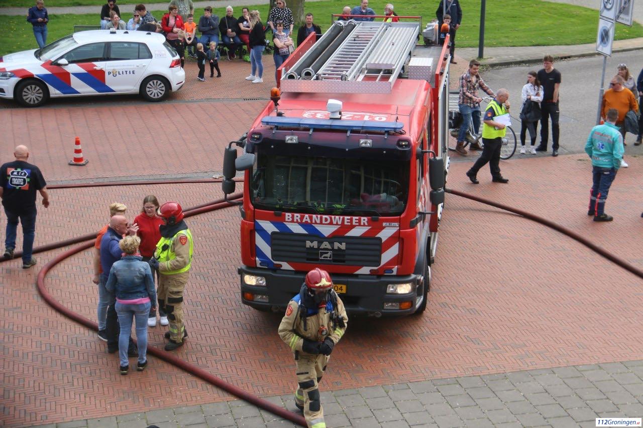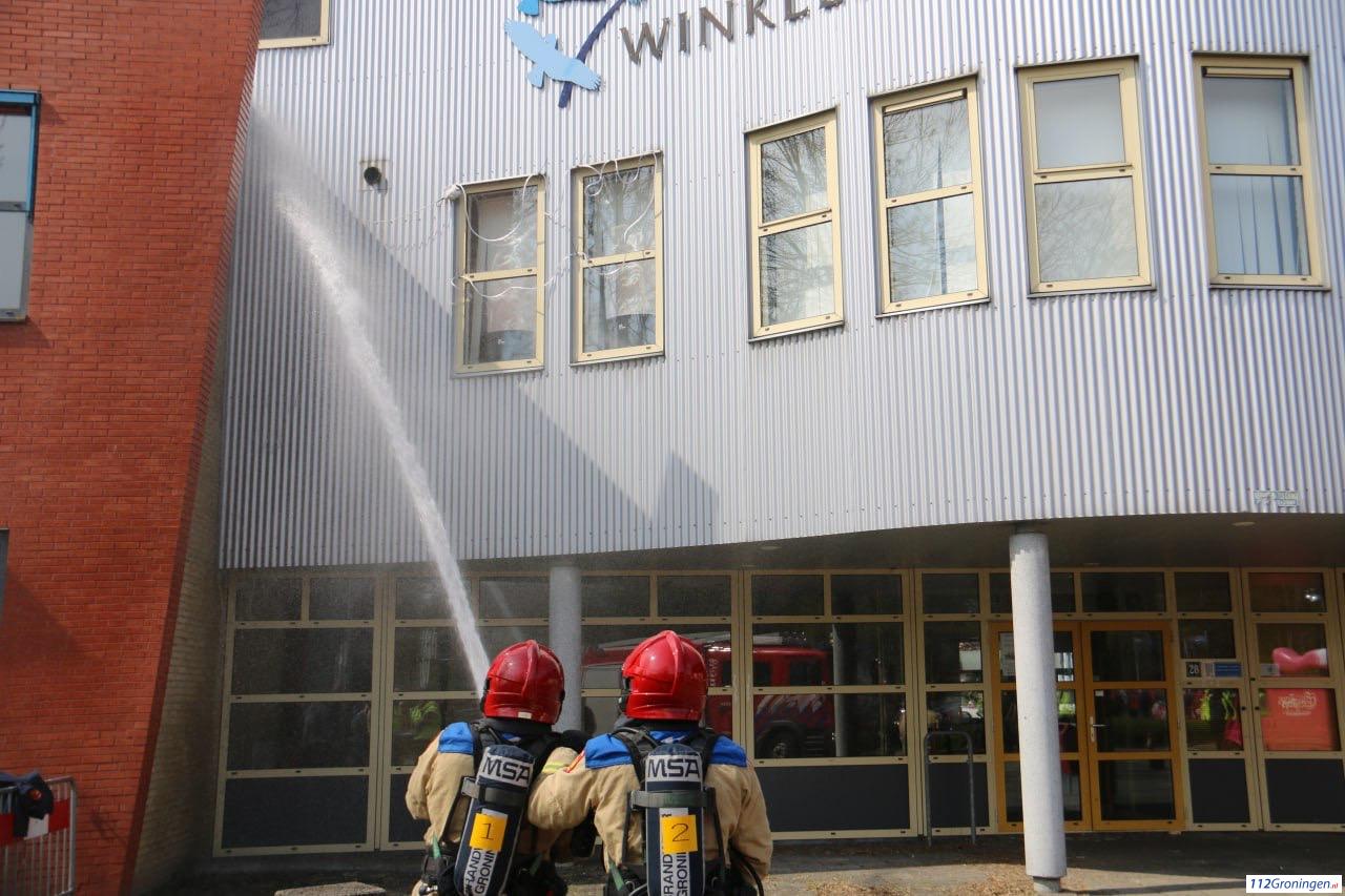 Aan de voorzijde (J.G. Pinksterstraat) bij de hoofdingang werd de klasse brandbestrijding gespeeld.