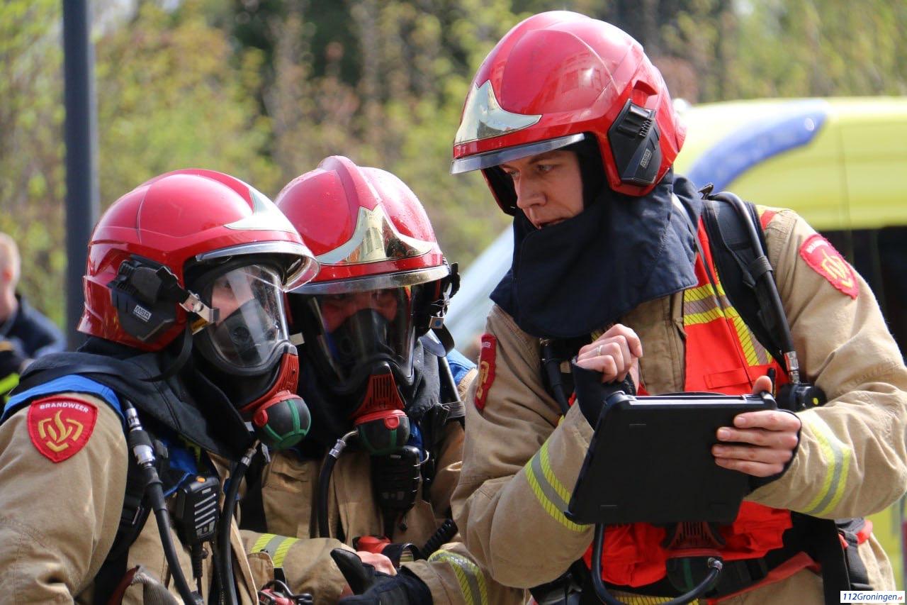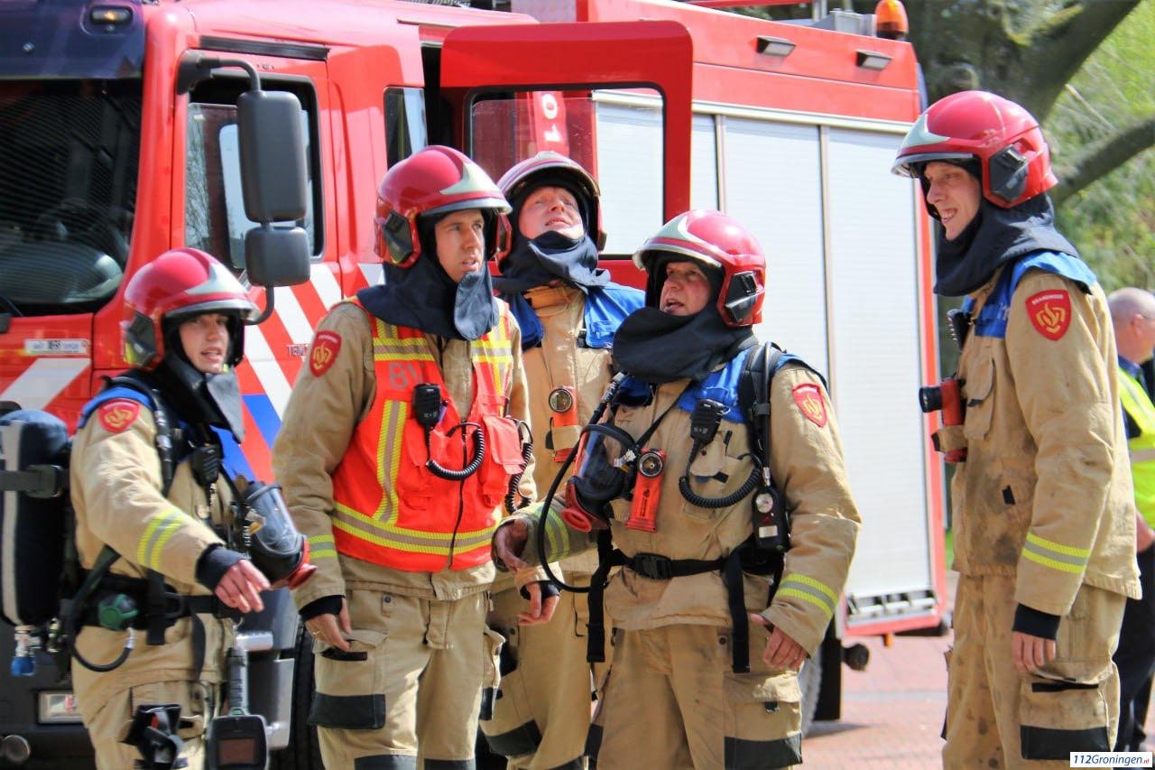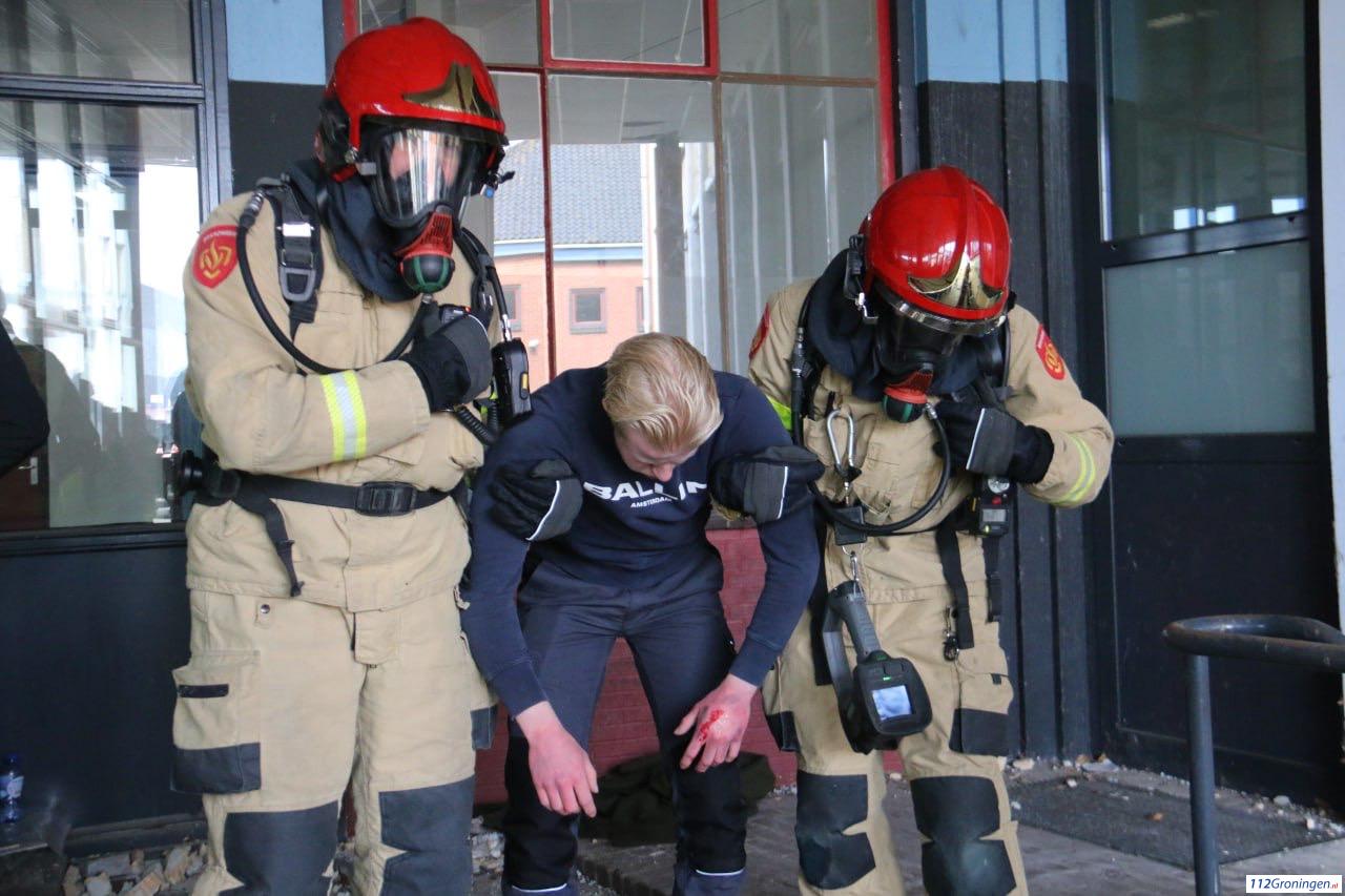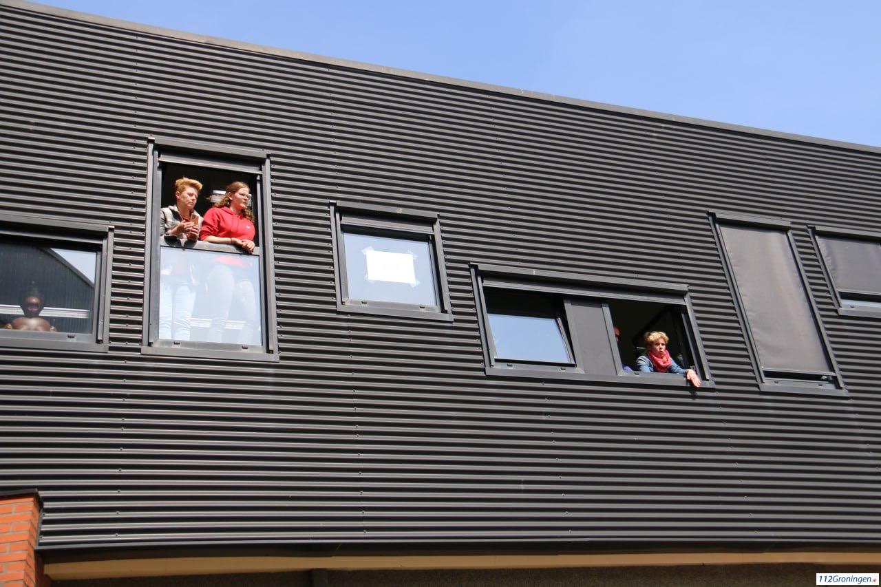 Aan de voorzijde (J.G. Pinksterstraat) bij de hoofdingang werd de klasse brandbestrijding gespeeld.