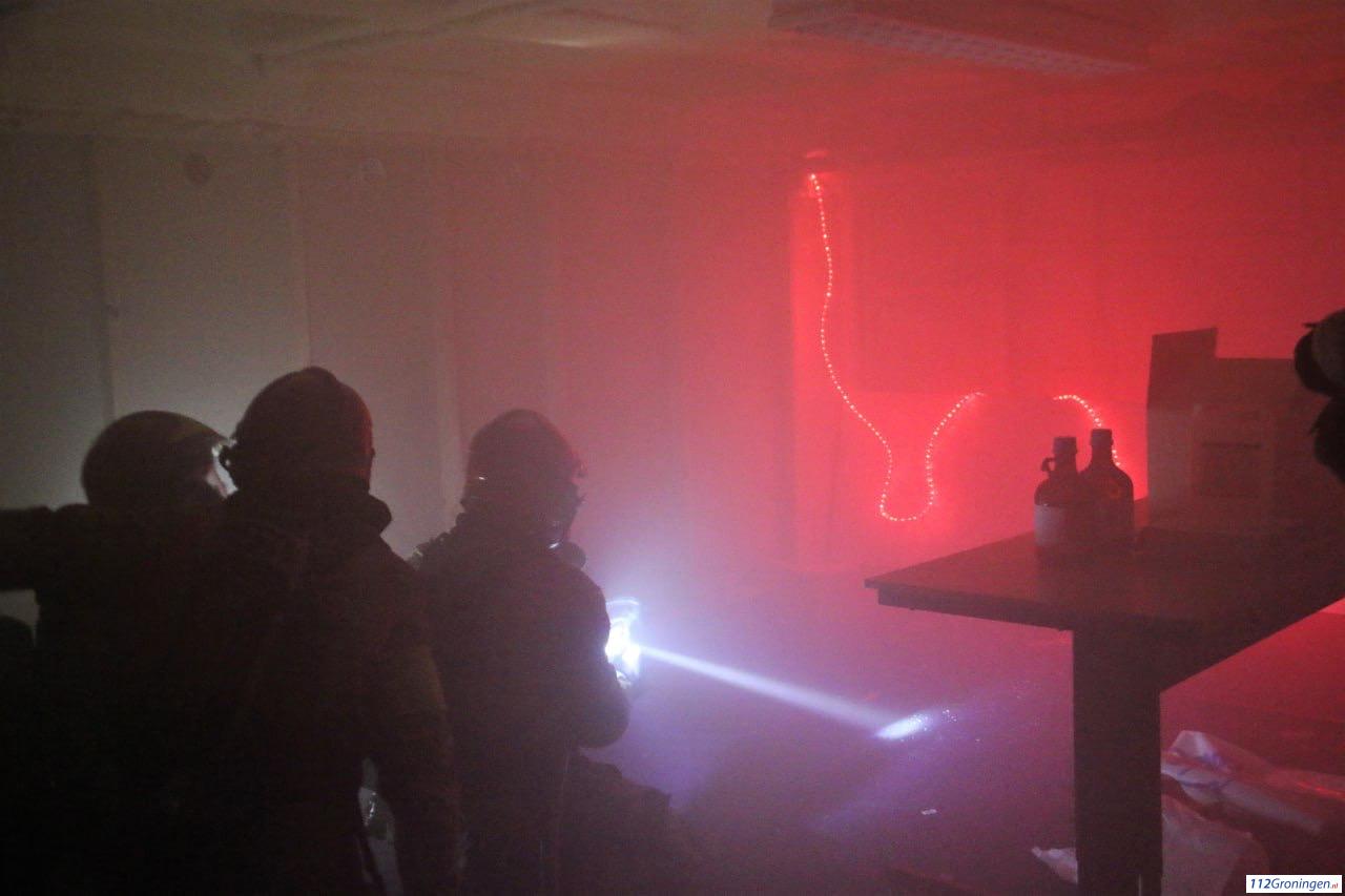 In de kelder van het gebouw zijn op hetzelfde moment mensen bezig een voormalig drugslab op te ruimen waarbij een brand ontstaat. Onder aan de trap ligt een bewusteloos persoon, als deze na 10 minuten niet is gevonden komt hij bij en loopt hoestend naar boven. Hier meld hij dat er brand is in de kelder en dat er nog iemand binnen is.