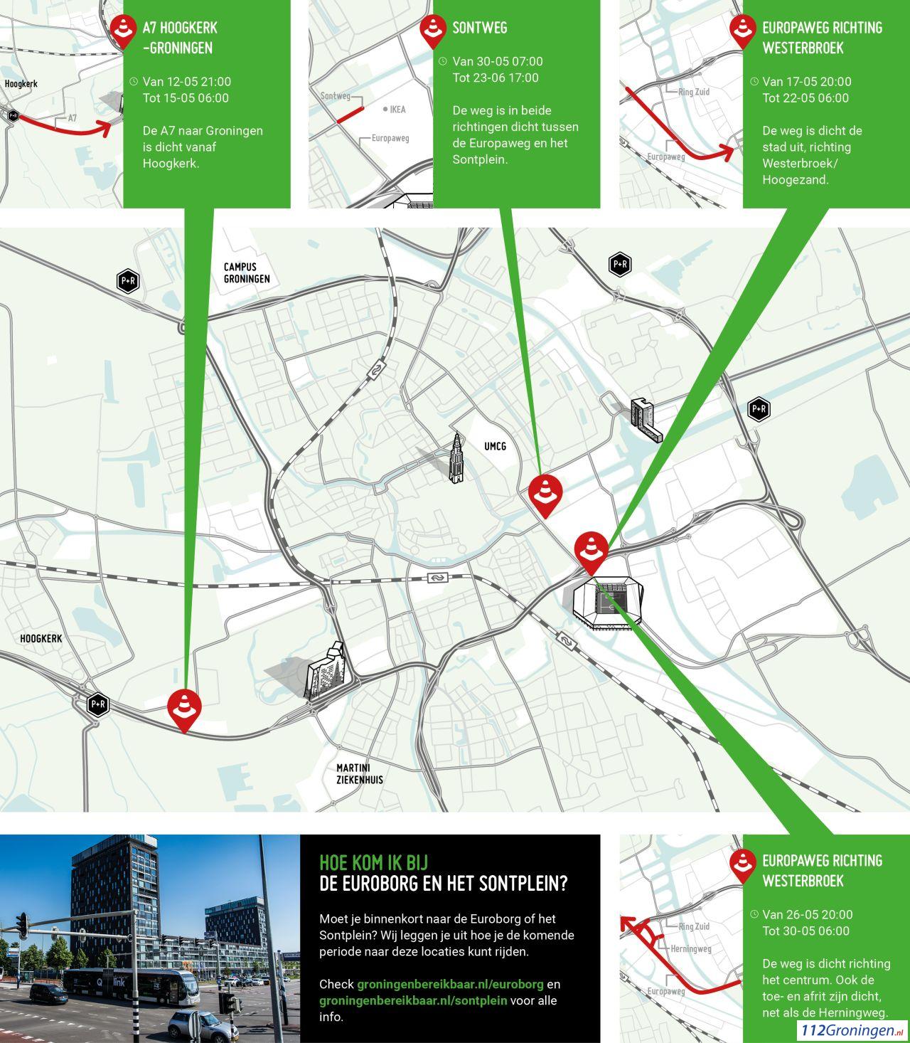 Behalve de afsluitingen die in de komende periode starten, zijn er ook lopende werkzaamheden die voor verkeershinder zorgen. Zo is de Noorderstationsstraat dicht voor alle verkeer. Op de Brailleweg is op dit moment een rijstrook dicht voor auto’s, daardoor kan je vanaf het Emmaviaduct niet de A28 oprijden. De Peizerweg is nog dicht tot begin augustus. De toerit van de Europaweg is de komende weken ook nog dicht. En op de A7 is tot 2 juni een rijstrook afgesloten voor verkeer naar Groningen. Ook kan je niet van Ring Zuid naar Ring West vanuit het Julianaplein.