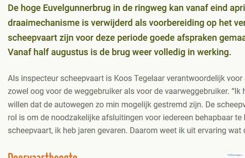 De reguliere binnenvaart heeft er dus amper last van dat de hoge Euvelgunnerbrug enige tijd niet open kan. “Het zijn vooral de scheepswerven die hier last van hebben. Die zitten onder andere in Foxhol en Martenshoek. Hier wordt ongeveer elke zes weken een nieuw schip afgebouwd. De schepen die klaar zijn, moeten vanaf de scheepswerf worden versleept naar Delfzijl. Daar worden ze gekeurd en daarna gaan ze de zee op.” Voor deze schepen is er geen alternatief, zegt Koos. “Deze schepen moeten wel door de hoge Euvelgunnerbrug, dat is de enige mogelijkheid. Ik zou graag willen dat er een alternatieve route was, haha. Dat had veel gescheeld.”