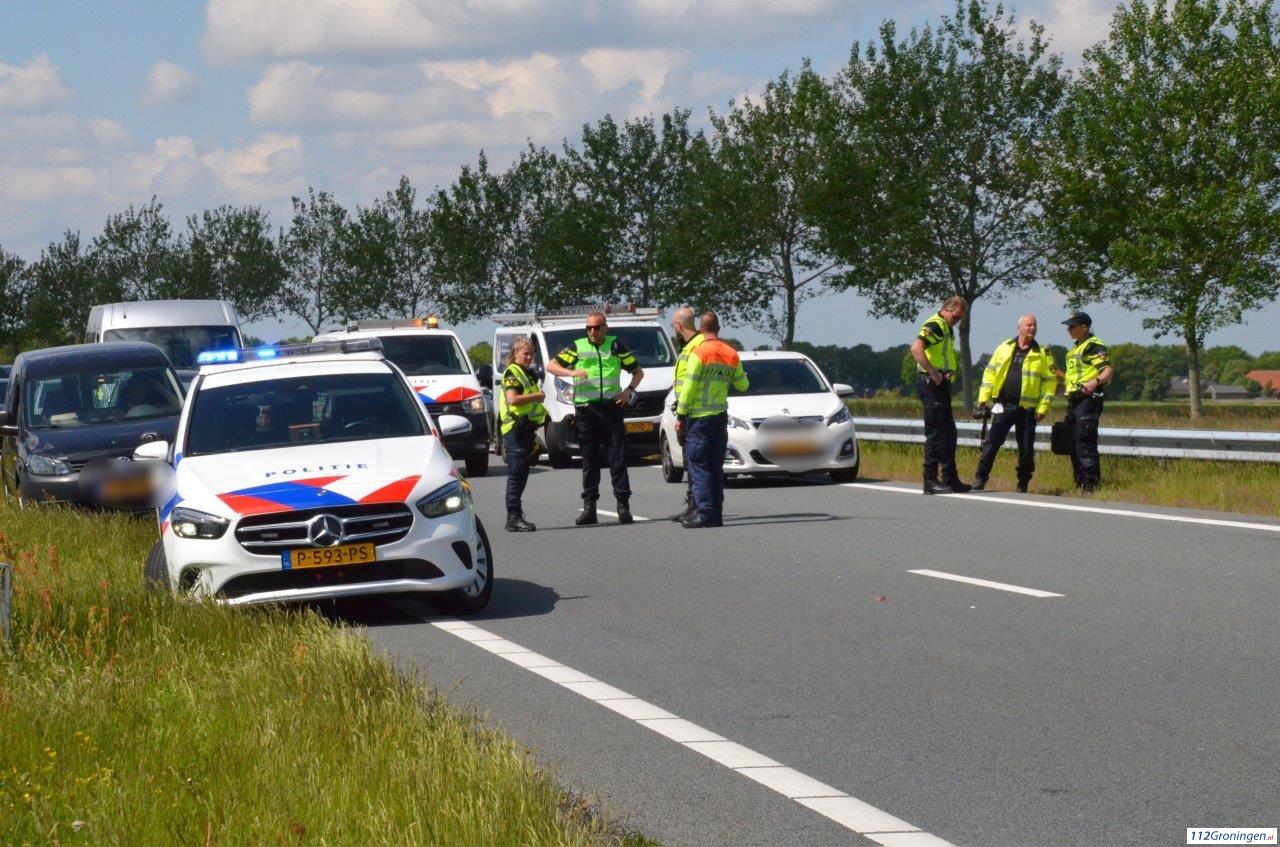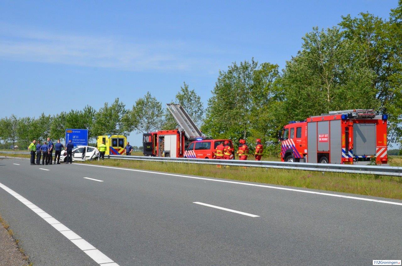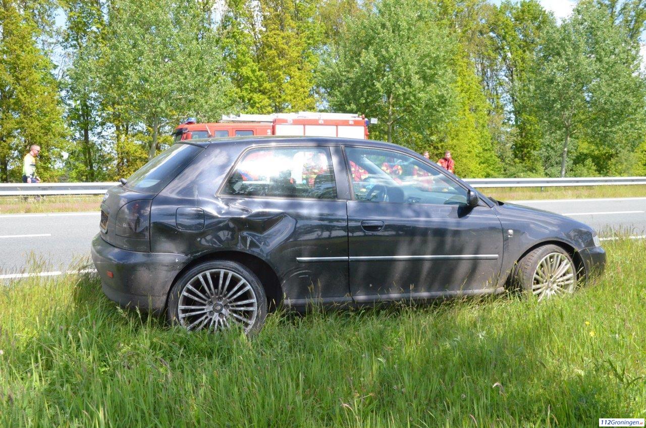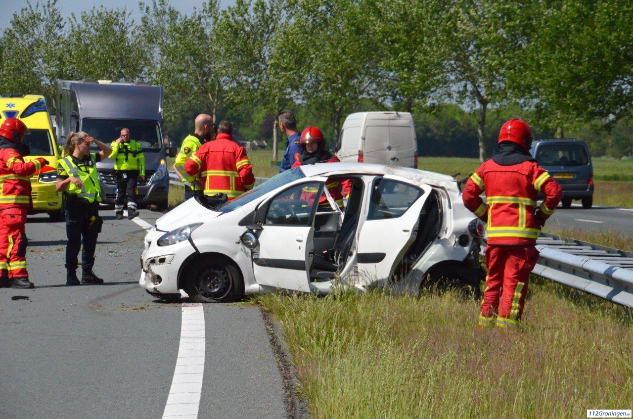 Twee auto’s zijn in de richting van Veendam op elkaar gebotst, waarbij één van de voertuigen over de kop is geslagen. Er zijn twee mensen gewond geraakt. De eerste hulpverlening kwam door een brandweerploeg die toevallig passeerde. Foto’s van DG-Fotografie.