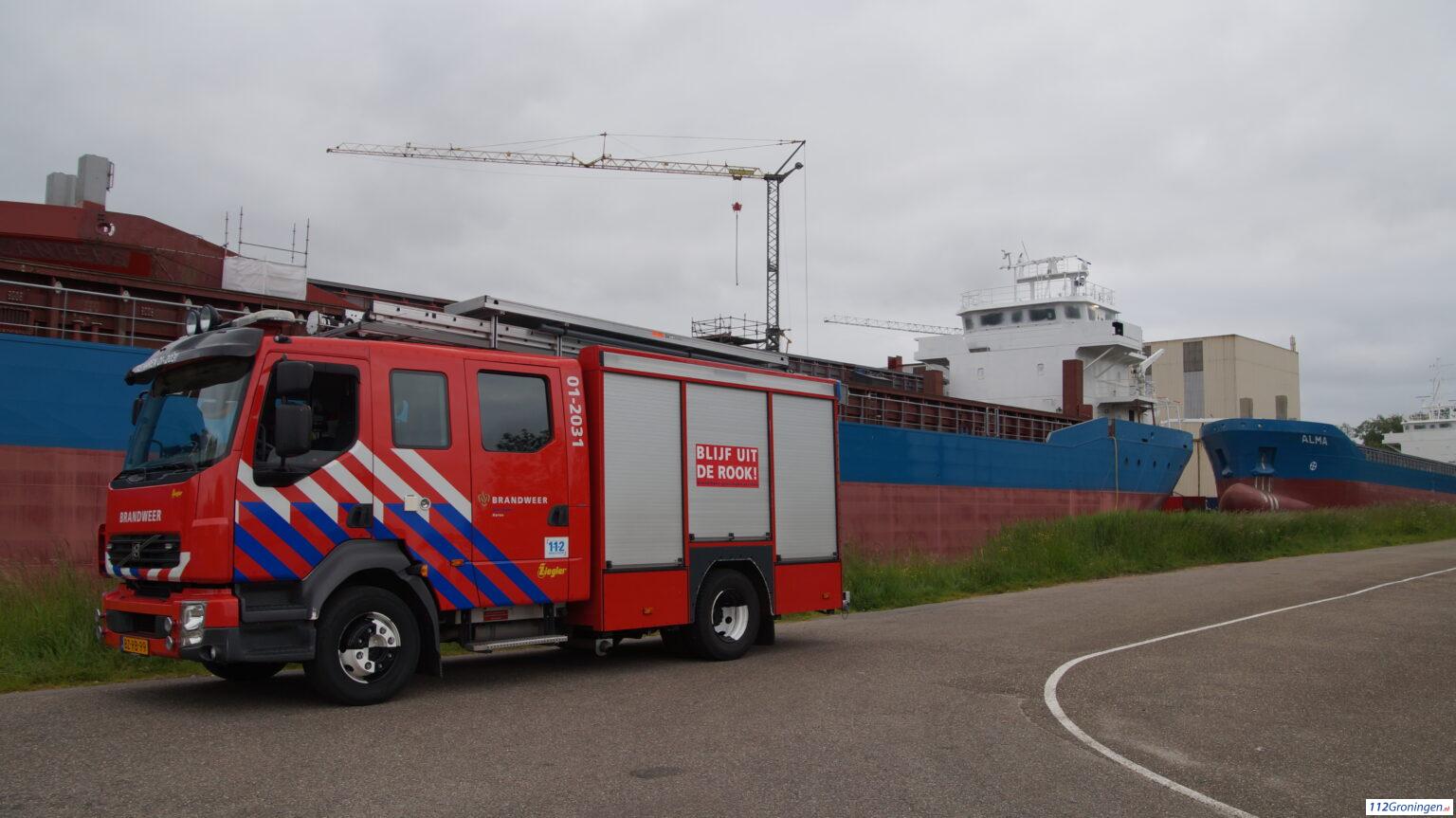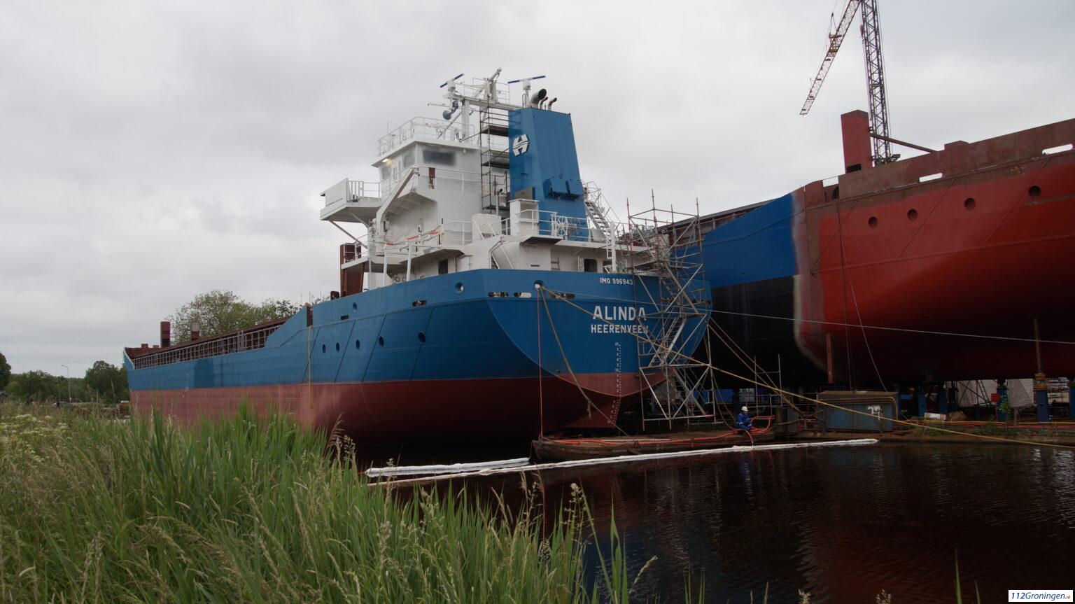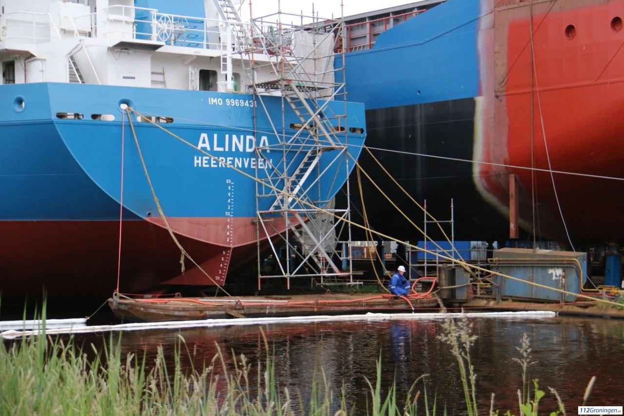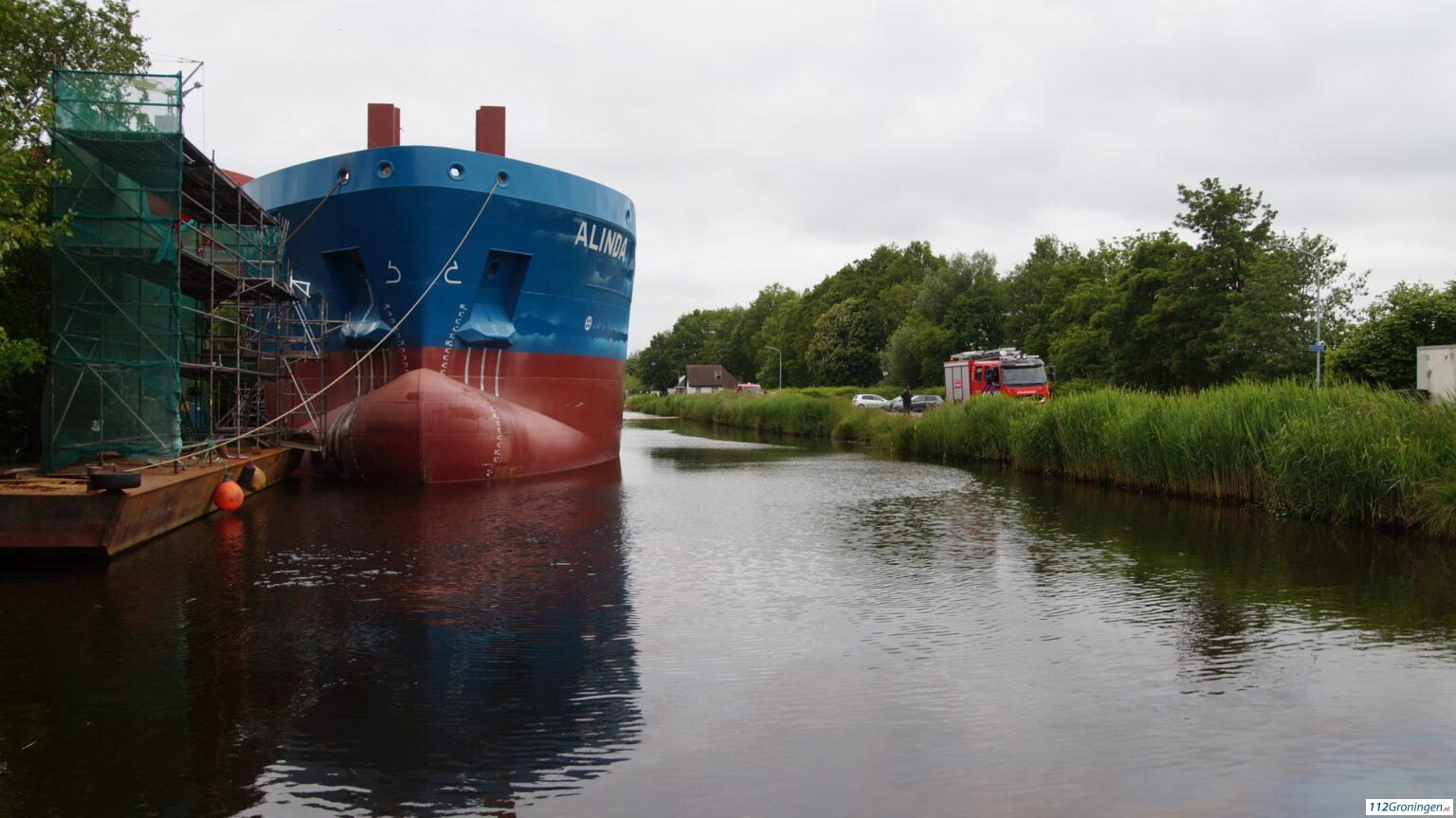 Er zou olie lekken uit 1 van de schepen, Hoe dit had kunnen gebeuren is onbekend. Het Waterschap was bang dat de olie het Winschoterdiep in stroomt dus brandweer Bedum legt de haven dicht.