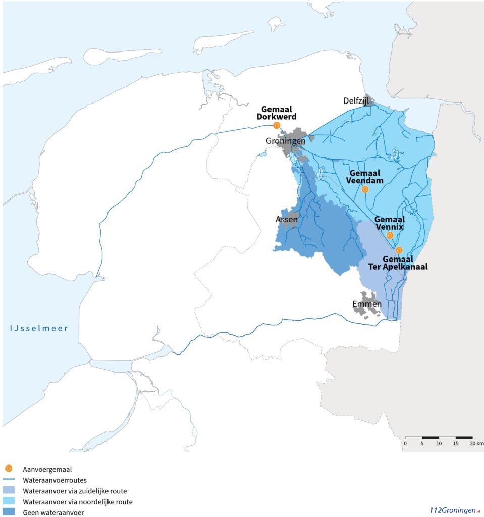Vanuit het IJsselmeer voeren we maximaal water aan. Het water komt via de noordelijke route bij gemaal Dorkwerd ons gebied binnen. Gemaal Veendam en Vennix zijn doorvoergemalen. Deze gemalen pompen het water richting Zuidoost-Groningen. Op deze manier voorzien we de noordelijke Veenkoloniën en Westerwolde van voldoende water. Daar waar het water normaal gesproken in ons gebied van zuid naar noord stroomt (van hoog naar laag), moeten we het water in droge perioden omhoog pompen naar het zuidoosten. Het zuiden van de Veenkoloniën ontvangt IJsselmeerwater vanuit de Hoogeveensevaart.
