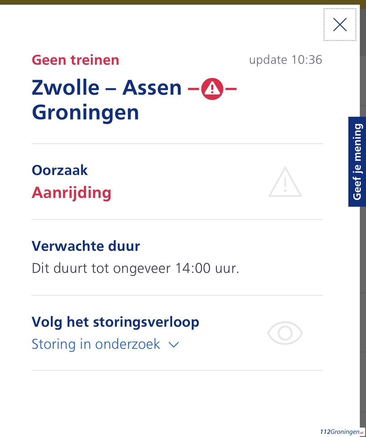 Groningen – Zondagochtend reden er geen treinen tussen Groningen en Assen, dit vanwege een aanrijding (met een persoon) volgens de NS Reisplanner.