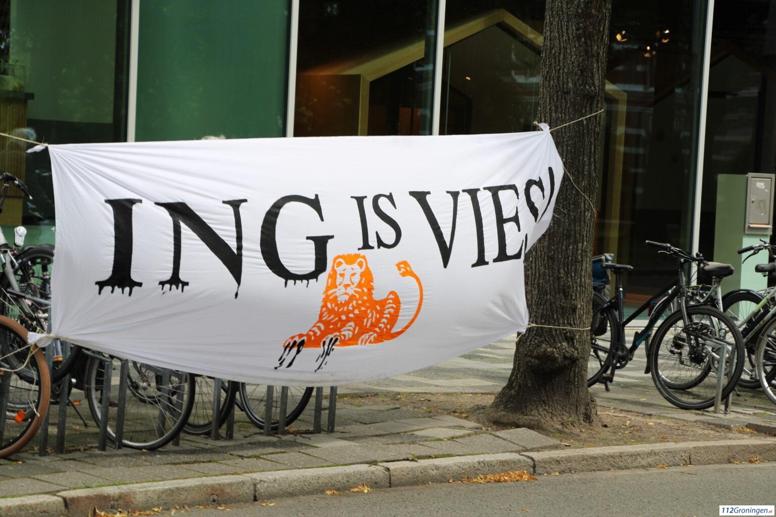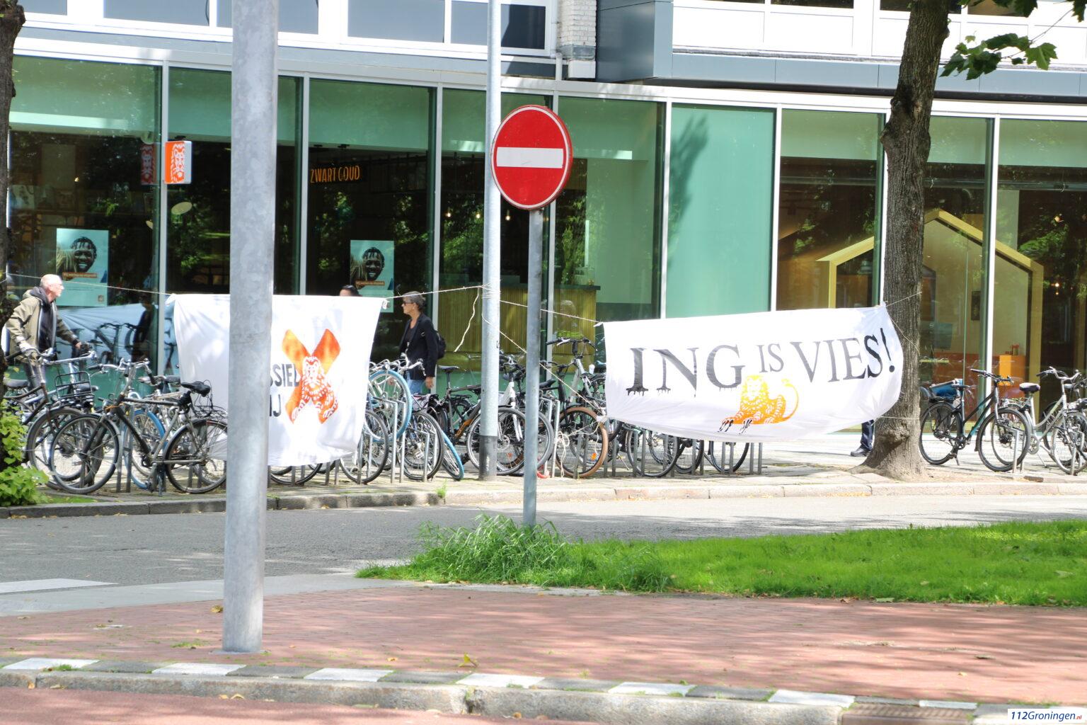 Er zijn ongeveer 20 demonstranten aanwezig bij het ING kantoor, zes daarvan hebben zich vast gekentekend aan elkaar. De demonstratie gaat over de fossiele investeringen wat ING doet. De demonstranten wilt dat ING dat stopt.