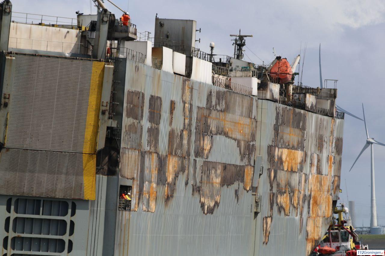 Eemshaven- De Fremantle Highway blijft tot de verbeelding spreken, want elke dag opnieuw komen honderden mensen naar de Eemshaven om het gehavende schip te bekijken. Het vrachtschip dat twee weken geleden boven Ameland in brand vloog, wordt in de haven door bergers leeggehaald.
