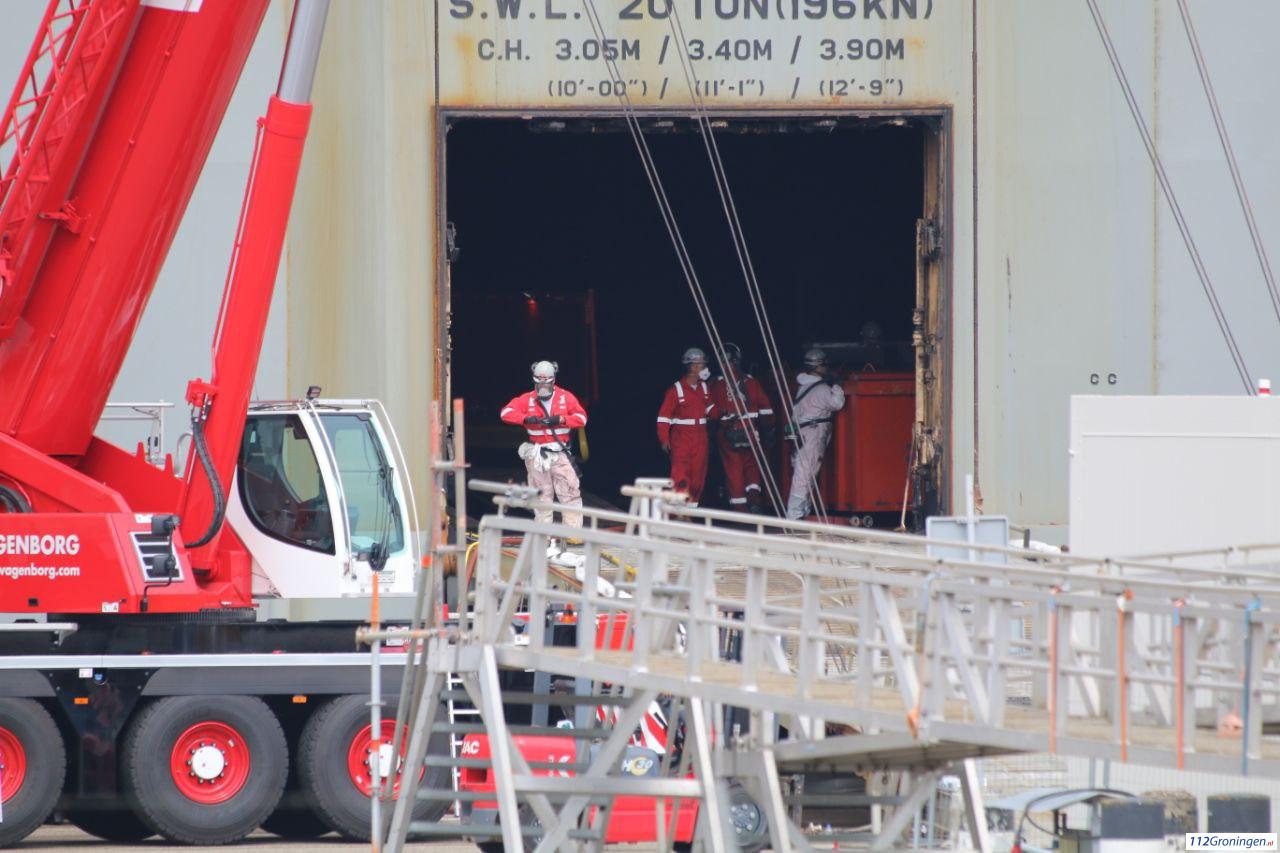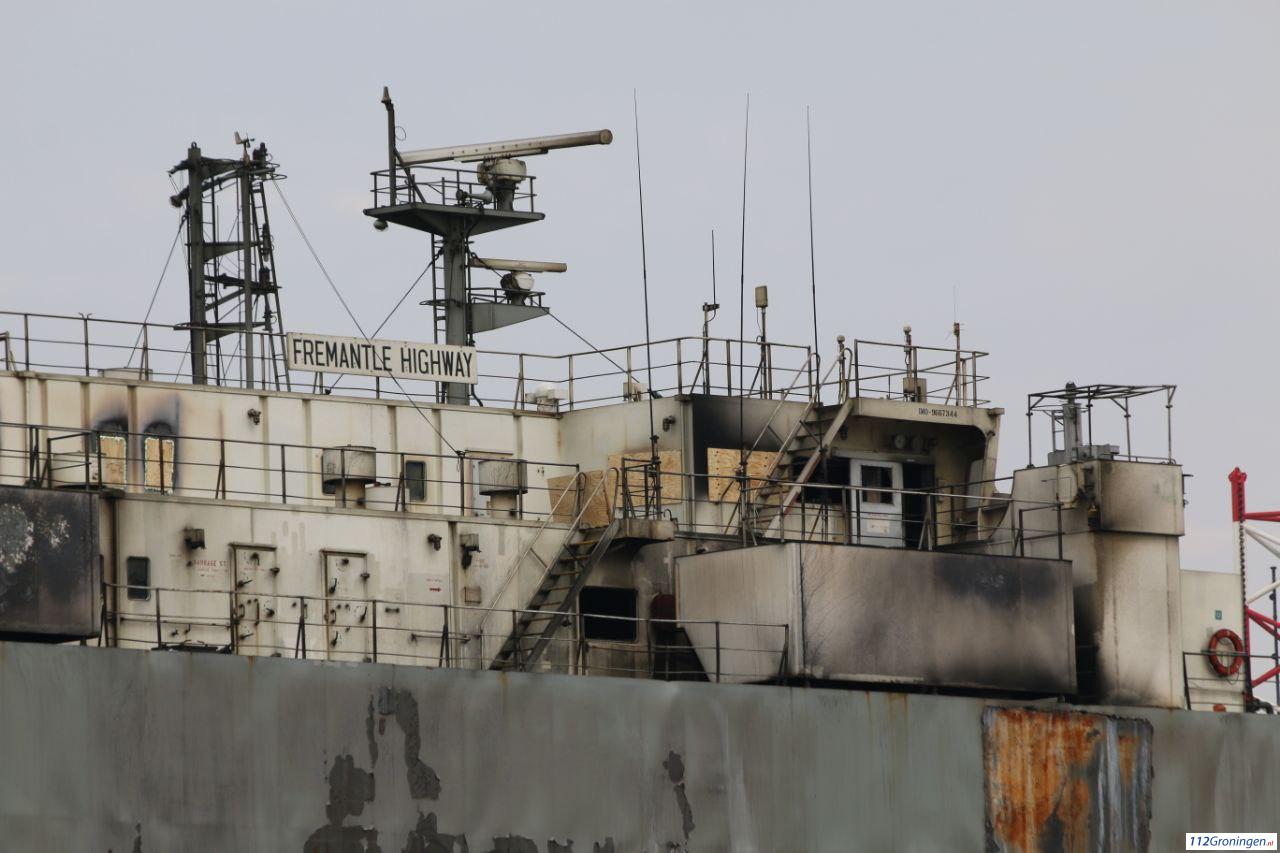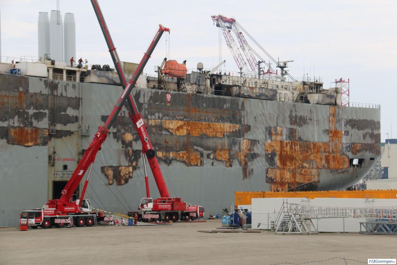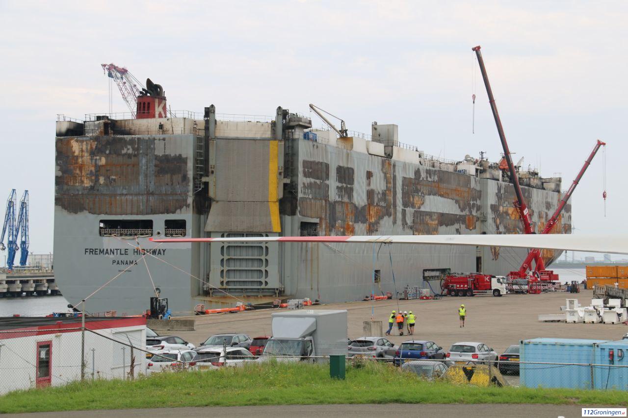 Eemshaven – Bergingsbedrijven zijn zaterdagochtend begonnen met het van boord halen van de auto’s aan boord van vrachtschip Fremantle Highway.