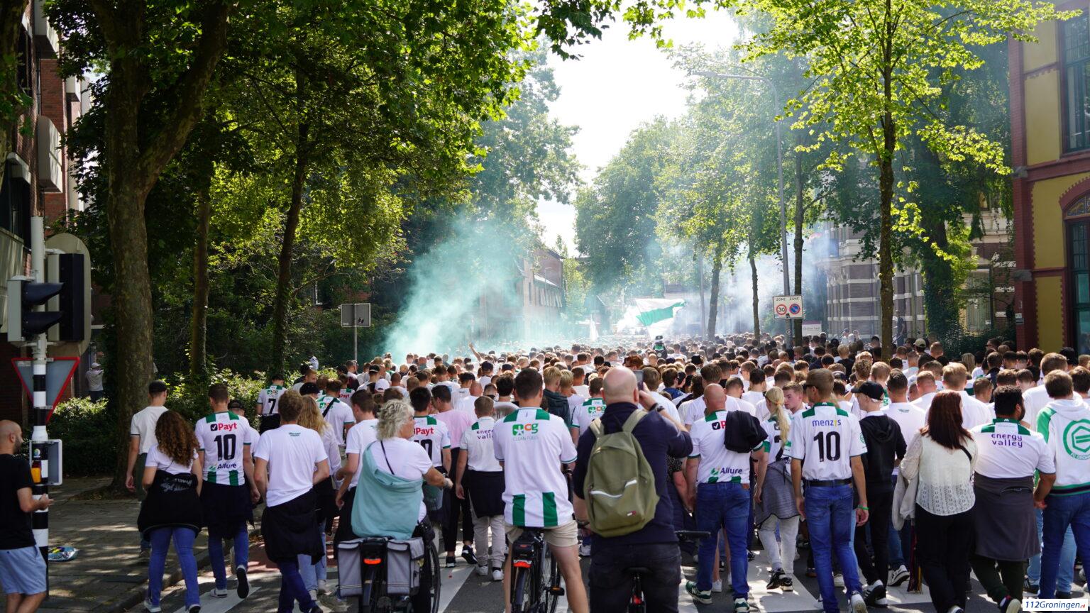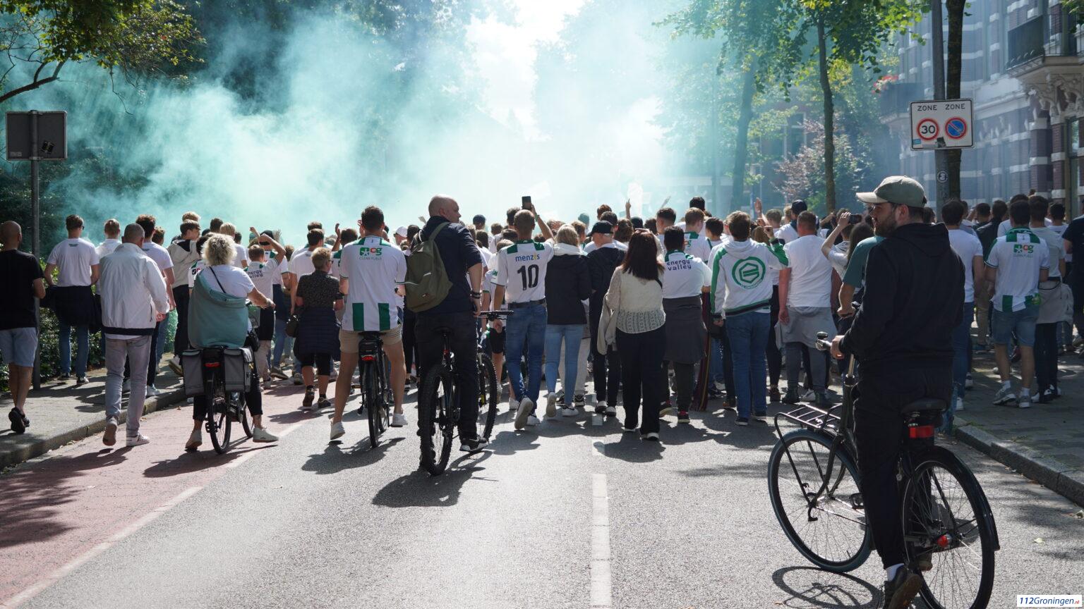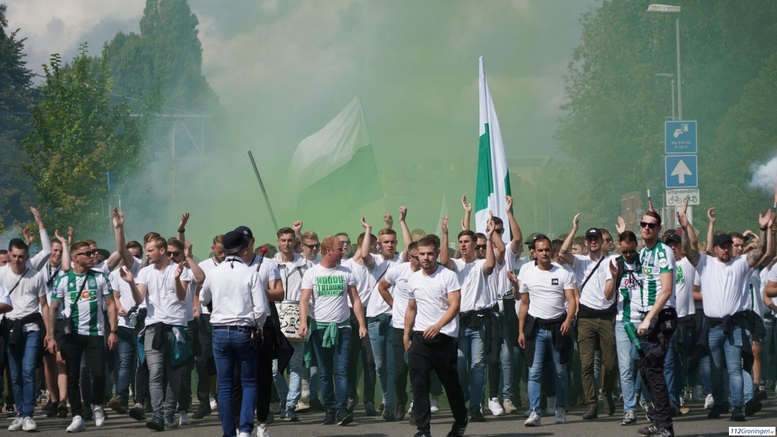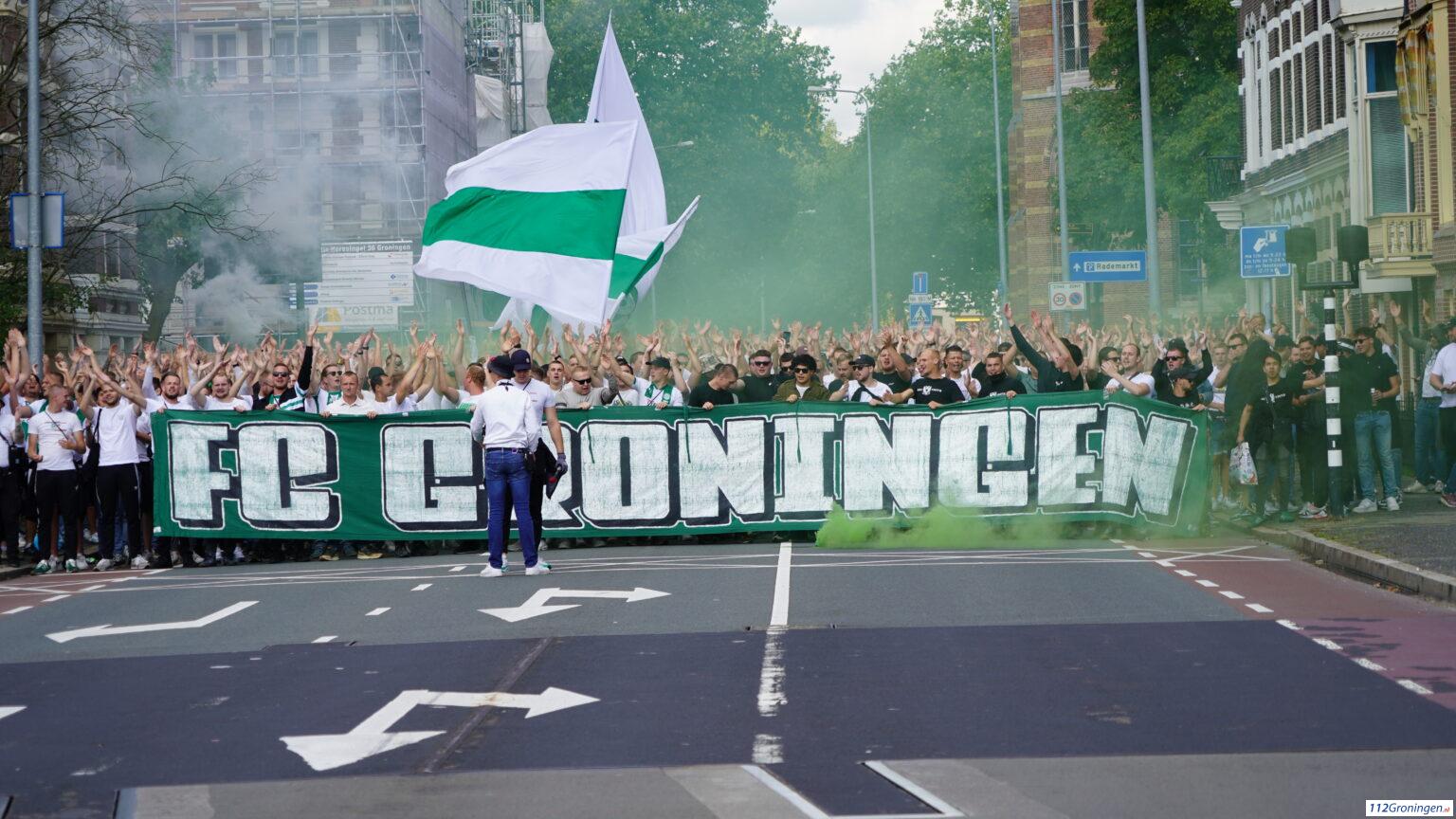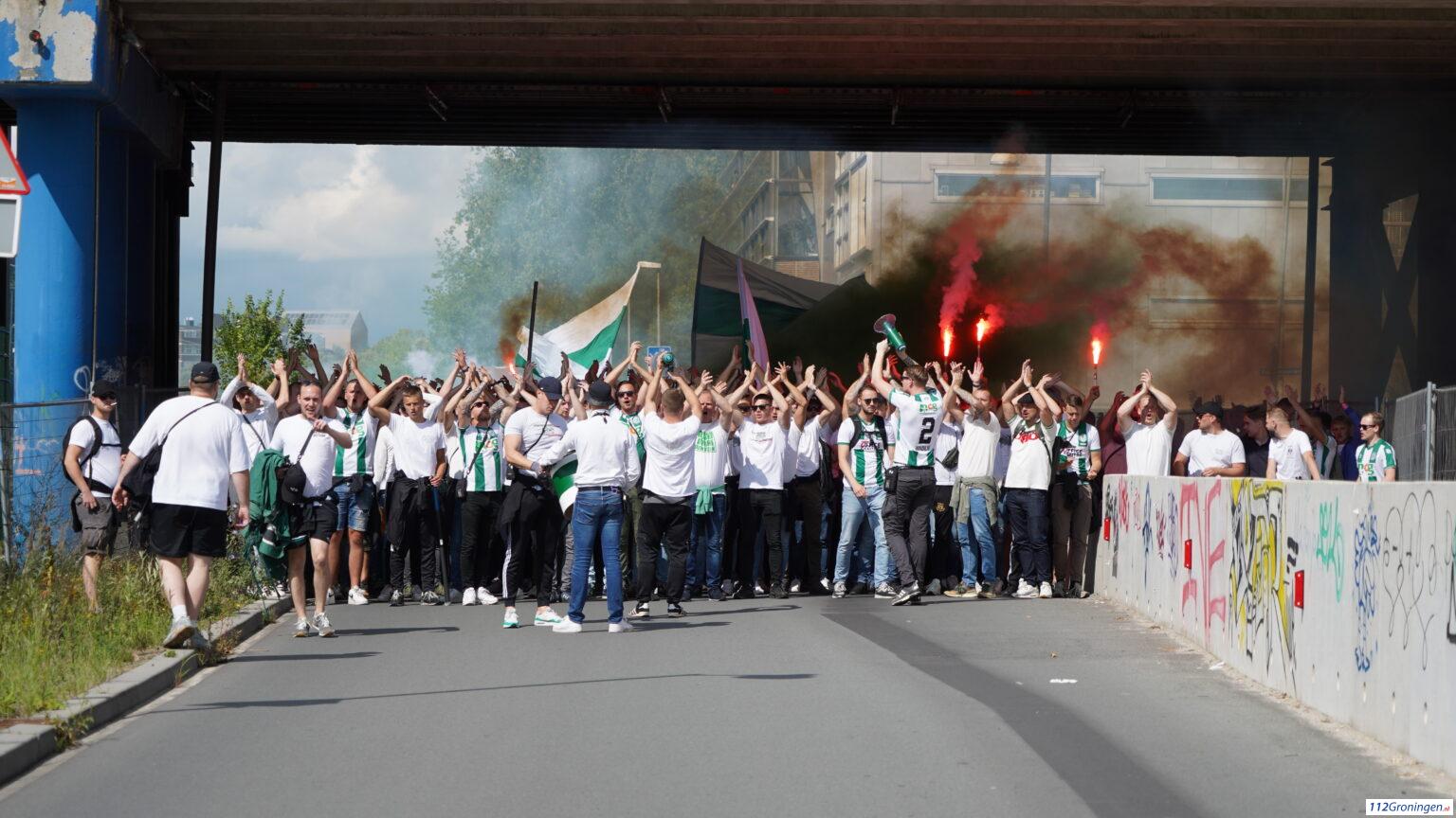 Groningen – Een groot Corteo met FC Groningen supporters reist door de stad op weg naar de Euroborg.