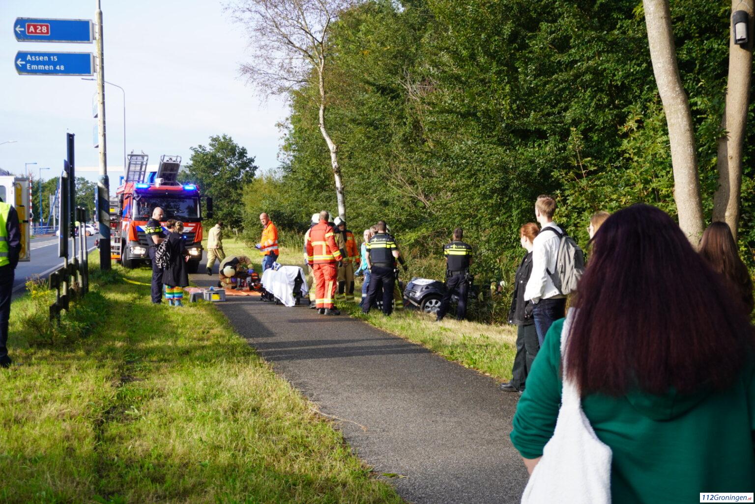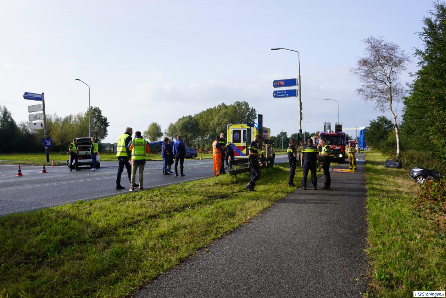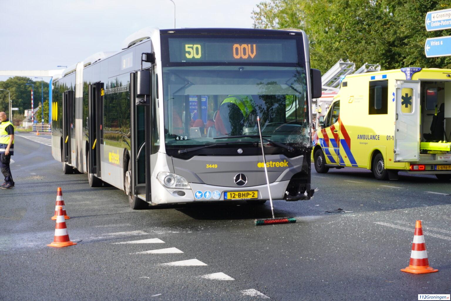 De Punt – Nabij de A28 bij De Punt zijn door nog onbekende oorzaak woensdagmorgen een bus en een auto tegen elkaar aan gebotst. De auto kwam daarbij in een sloot terecht.