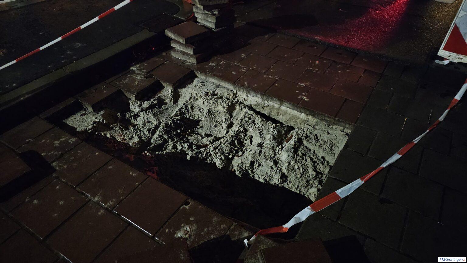 Een aannemer heeft het gat afgezet met borden en linten. Het is onbekend wanneer het gat wordt gerepareerd.