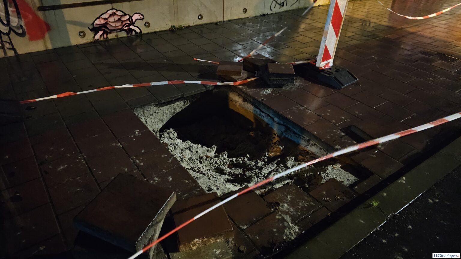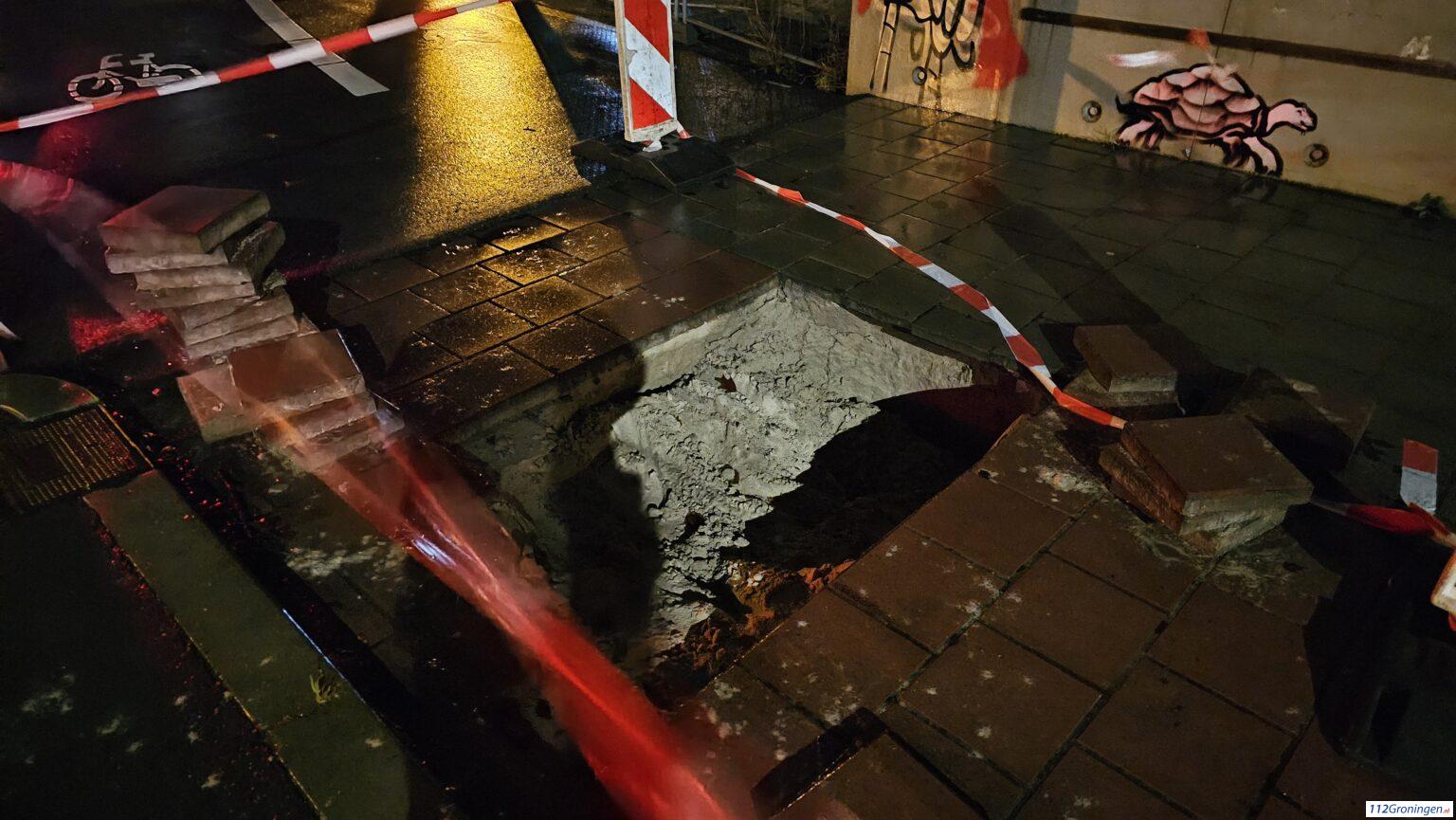 Groningen – Op het fietspad onder de N7 op de Hereweg is zaterdagavond een enorm gat ontstaan door vermoedelijk de vele regenval.