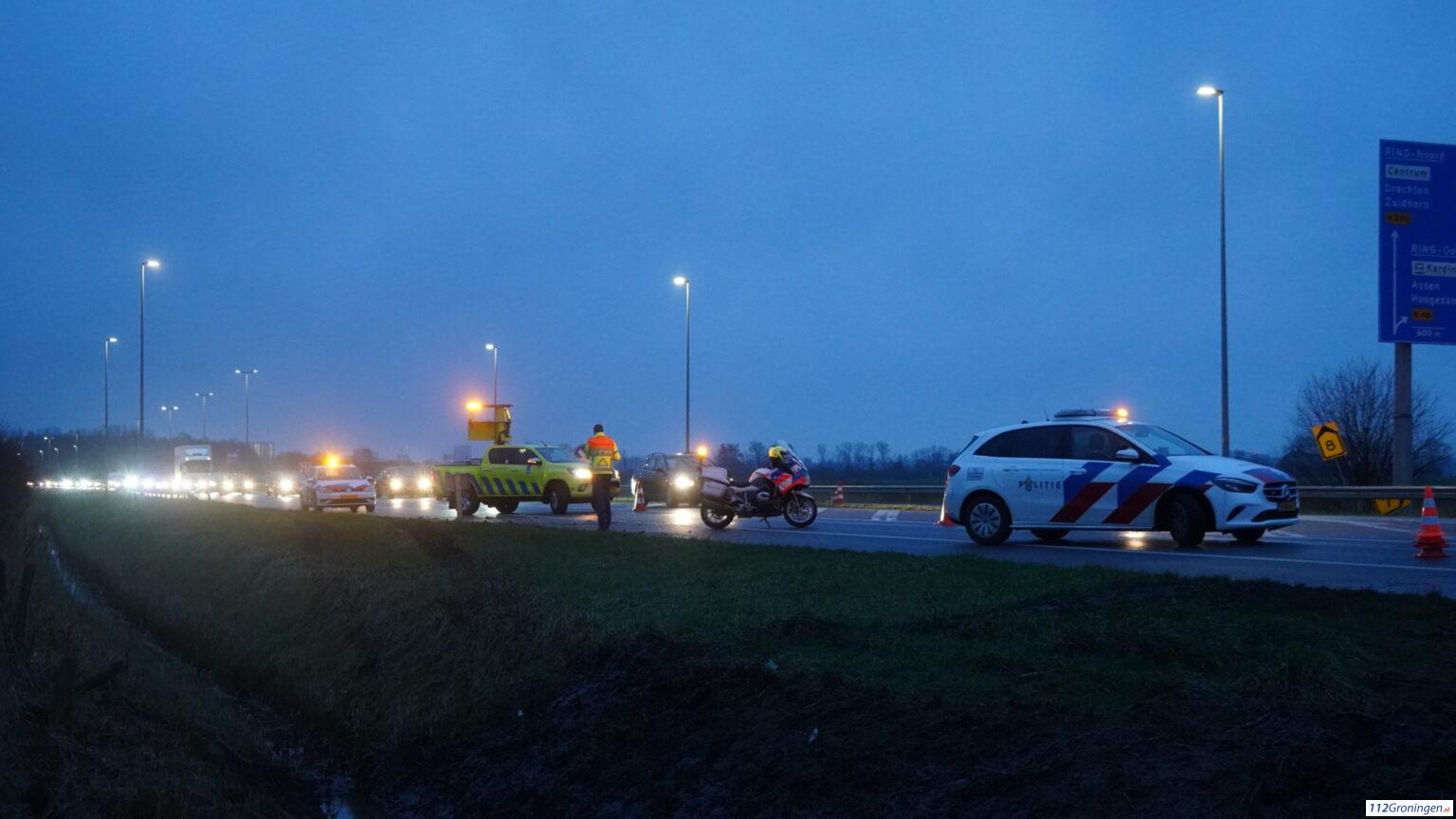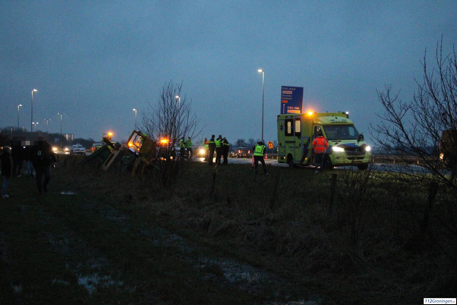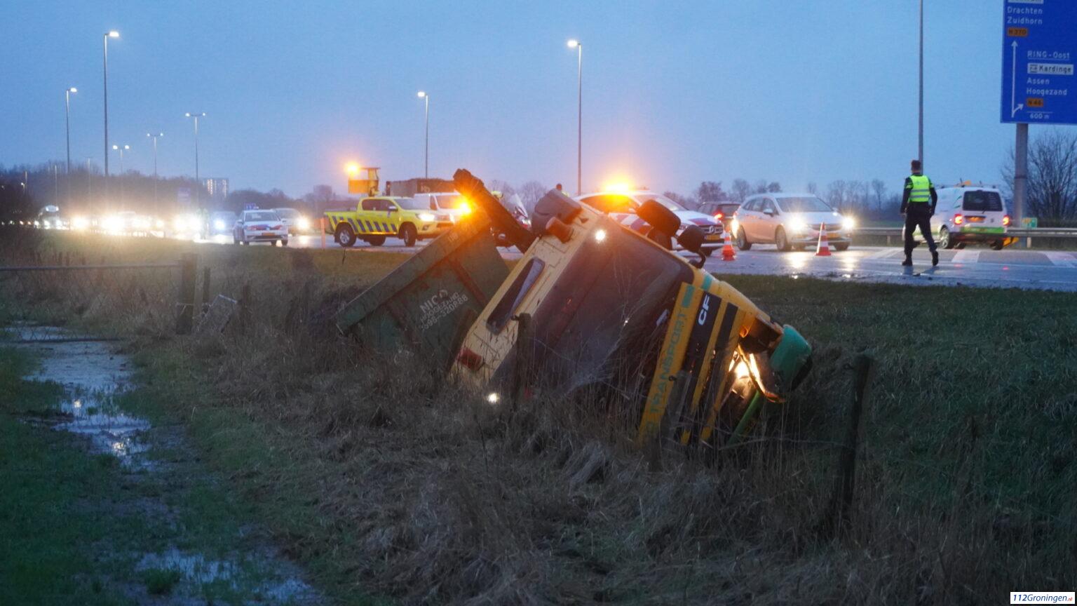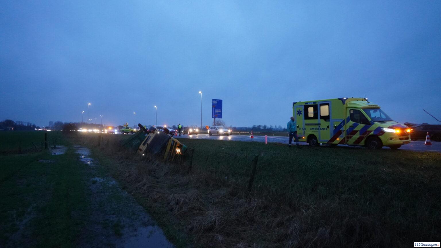 De politie onderzoekt de oorzaak. Het verkeer had last van het ongeval. Aan twee kanten ontstond een langefile. De chauffeur raakt gewond, deze werd behandeld in een ambulance. Berger Poort zal later vanavond het gevaarte bergen. Video.