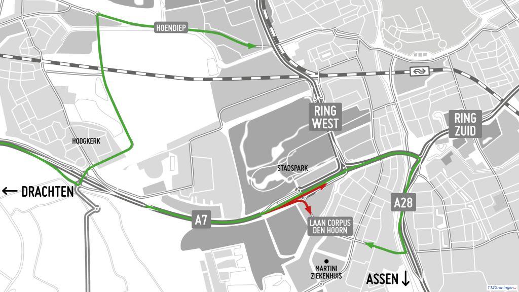 Verkeer richting de westelijke ringweg rijdt om via Hoogkerk. Wil je richting Corpus den Hoorn, bijvoorbeeld naar het Martini Ziekenhuis, dan word je omgeleid via het Julianaplein en de A28.