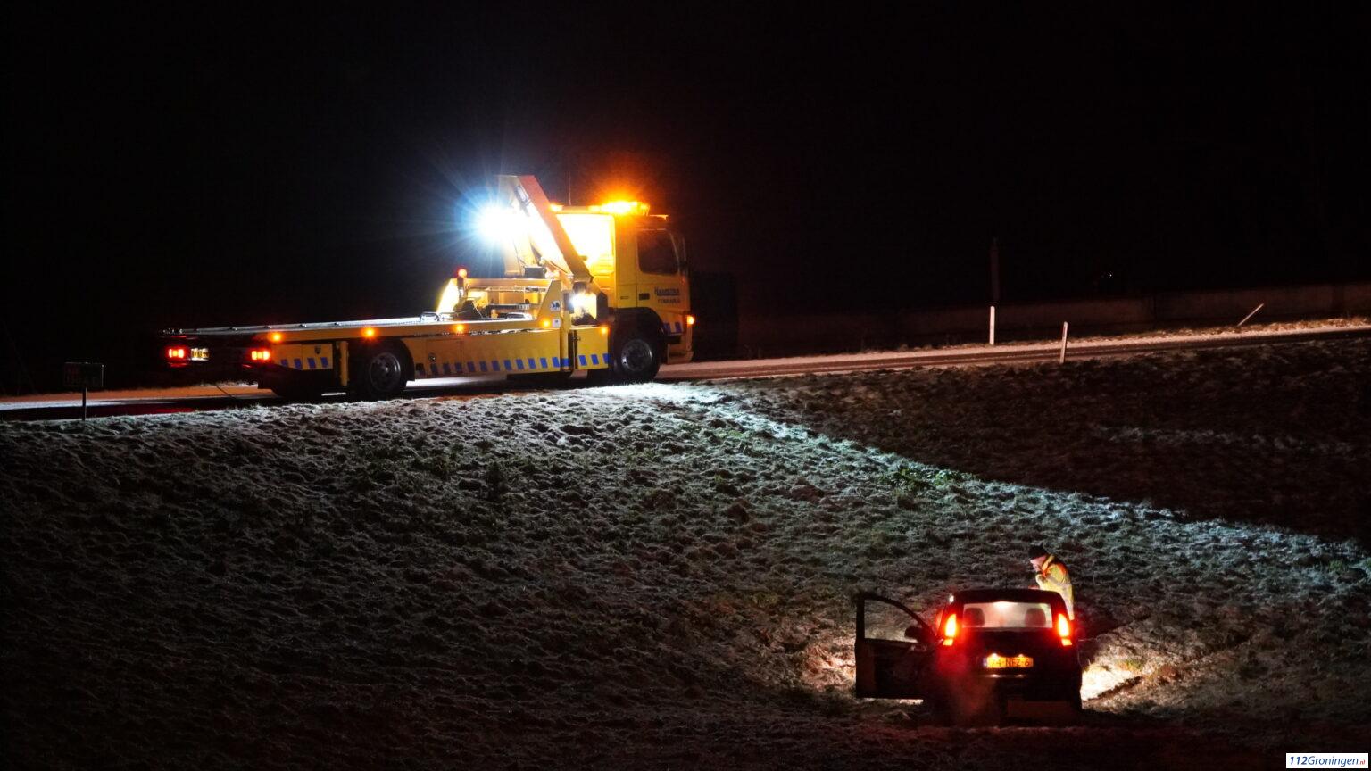 De Punt – Op de oprit naar de A28 bij De Punt is maandagavond rond 22:00 uur een auto uit de bocht gevolgen door de gladheid. Er zijn geen gewonden een berger kwam ter plaatse om de auto eruit te halen.