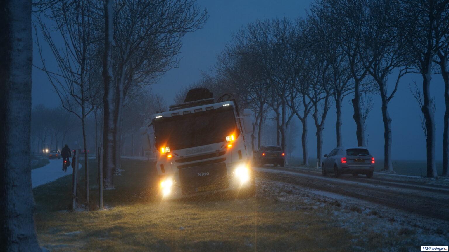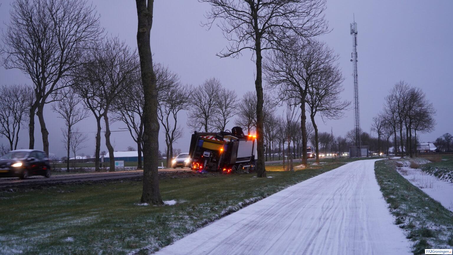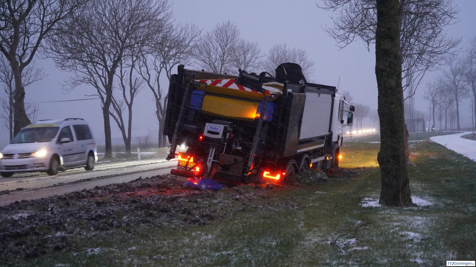 Winsum – Op de de N361 bij Winsum is een strooiwagen in de berm beland door de gladheid.