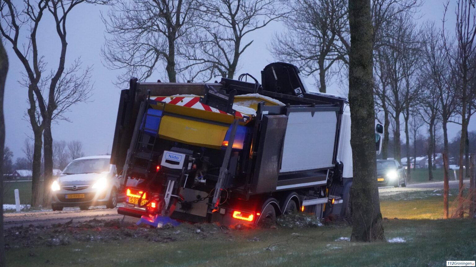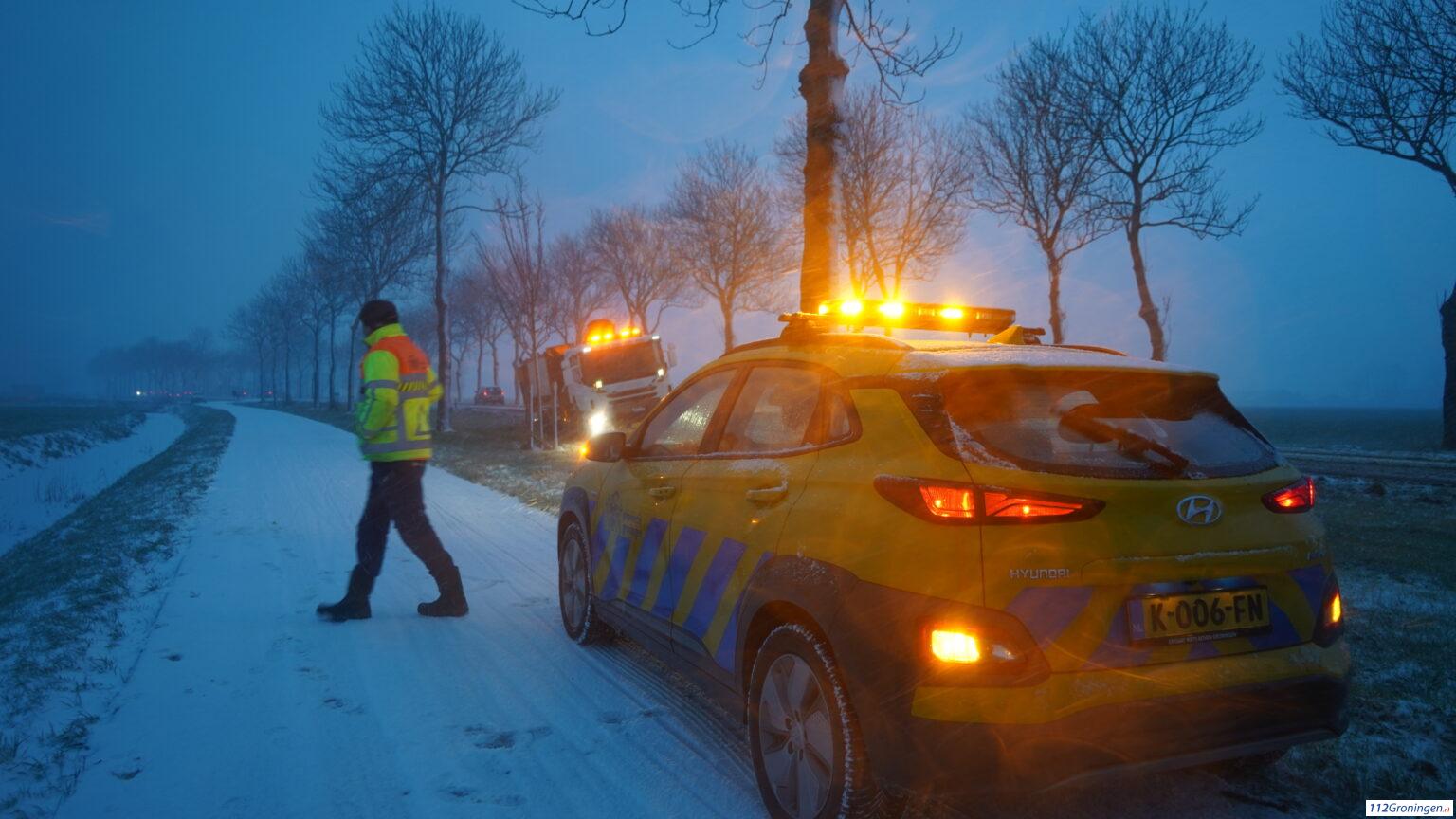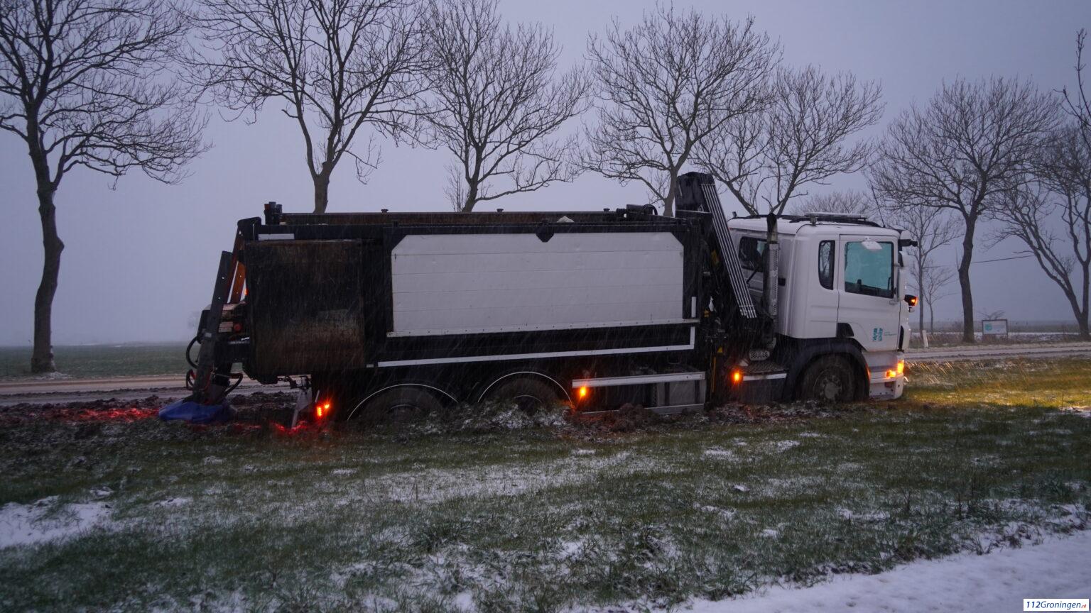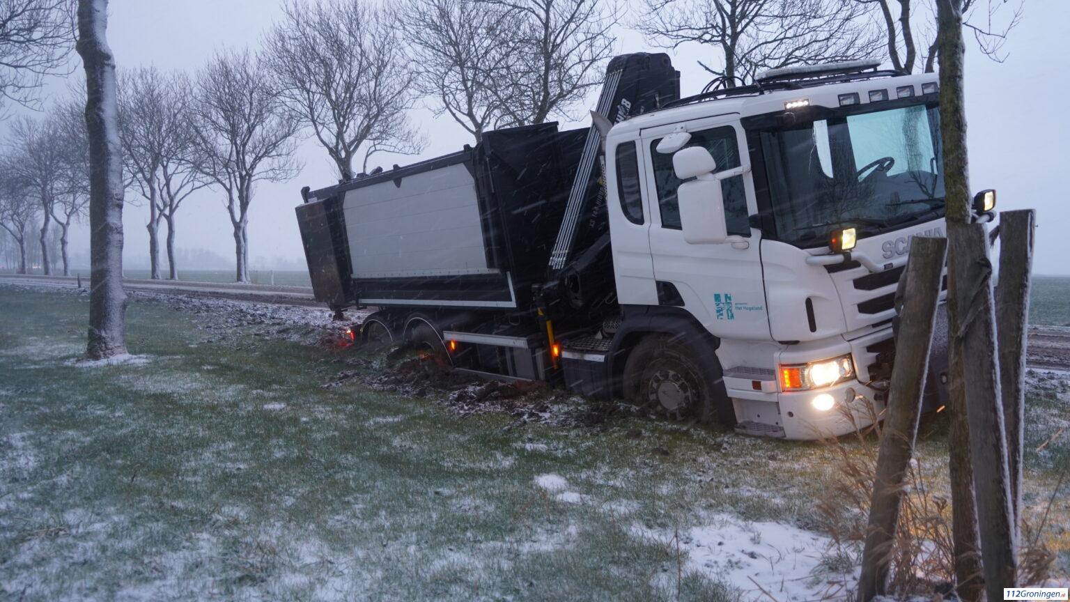 Winsum – Op de de N361 bij Winsum is een strooiwagen in de berm beland door de gladheid.