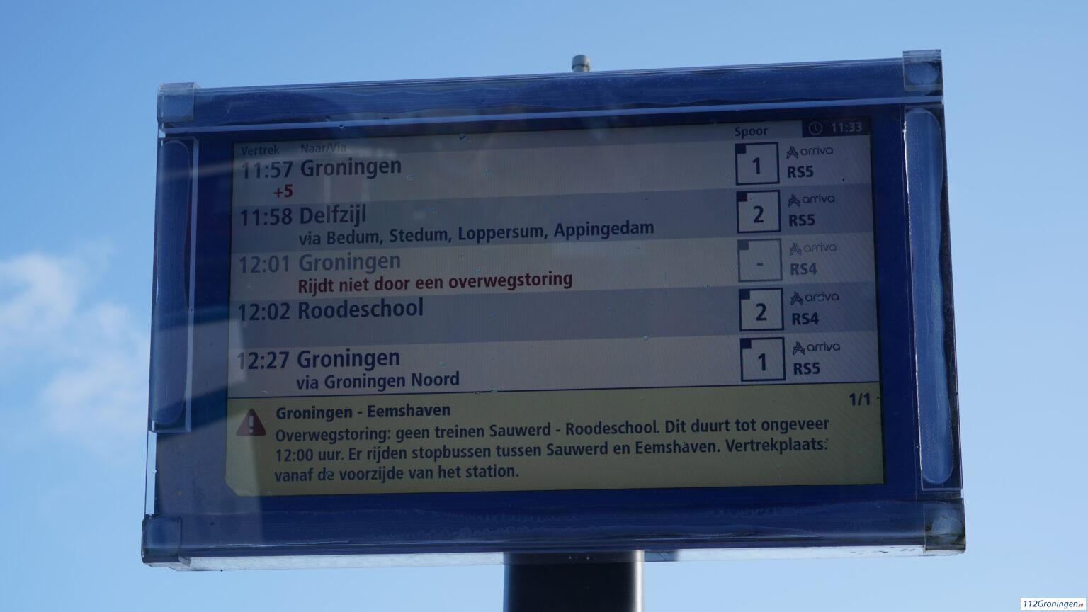 Sauwerd – Tussen Sauwerd en Roodeschool rijden tijdelijk geen treinen door een overwegstoring. De extra reistijd is meer dan 60 minuten. Dit duurt tot ongeveer 18:30 uur.