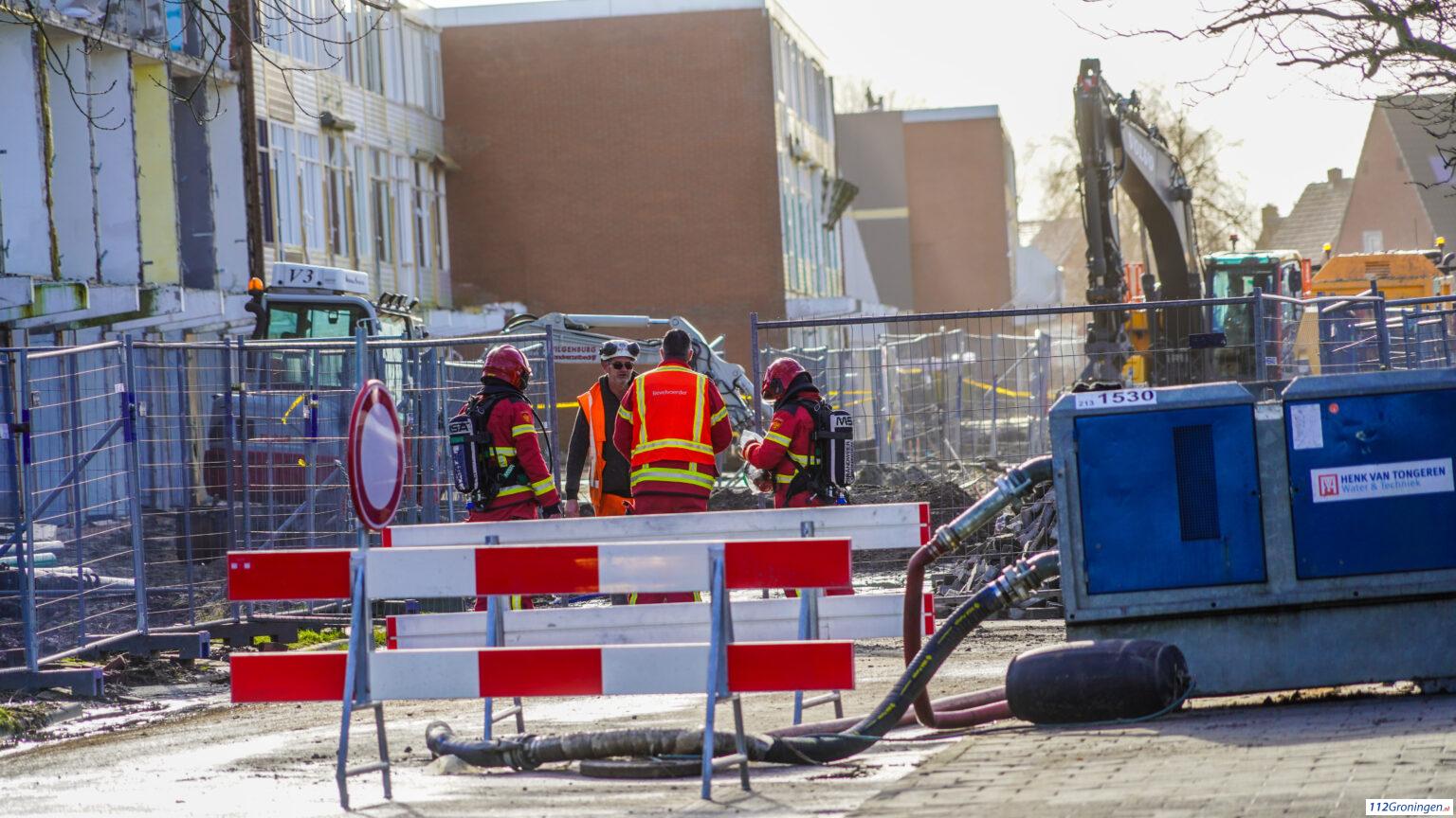 De brandweer doet onderzoek op een bouwplaats. De straat naar de bouwplaats is tijdelijk afgesloten. Enexis komt voor afdichting van het lek.