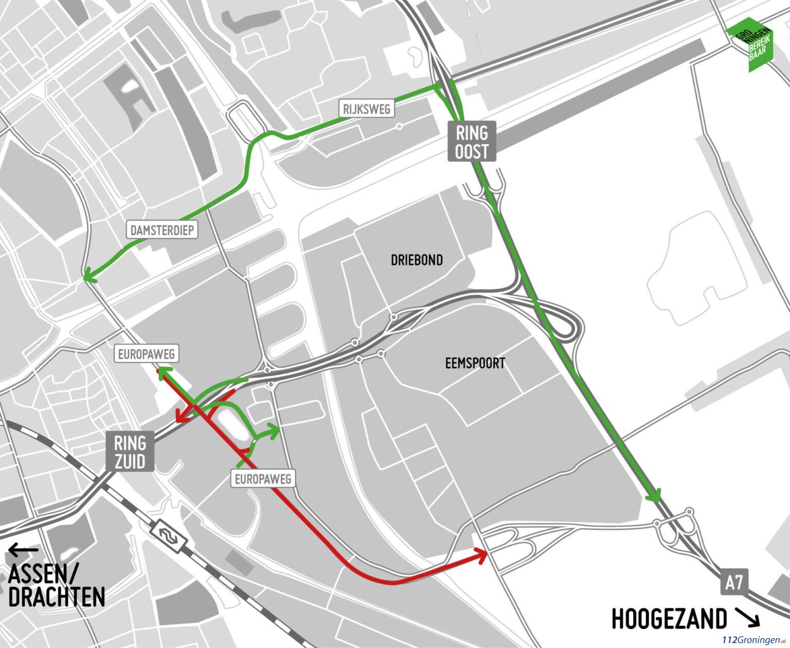 Ook de toerit vanaf de Europaweg is in beide richtingen afgesloten. De afrit 37 Groningen-Europapark blijft open.