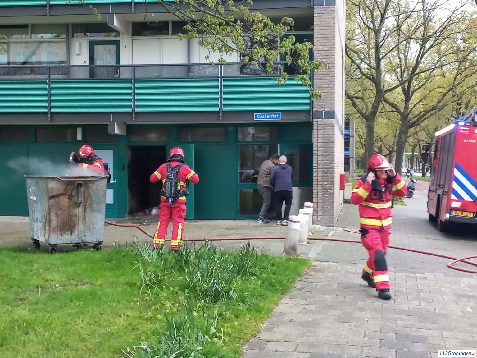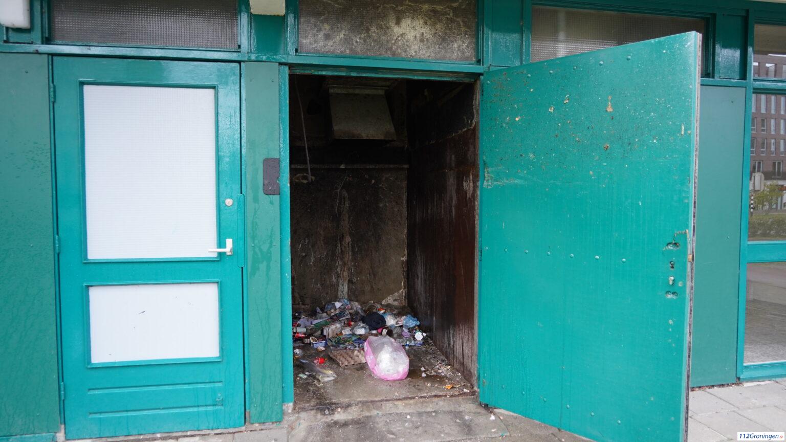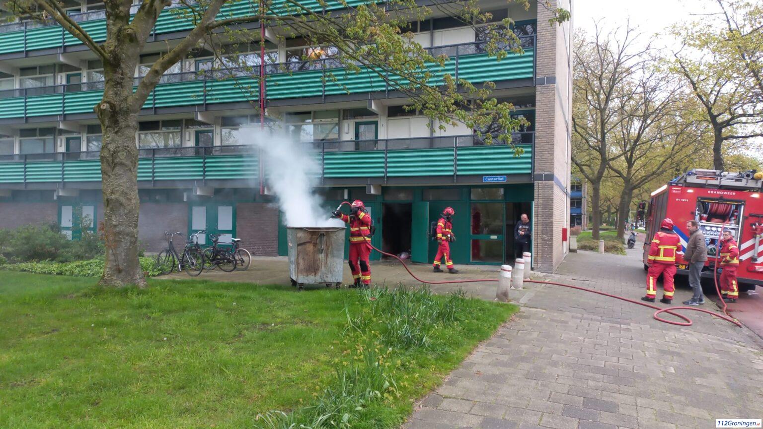 De brandende container stond in het afvalhok van de flat. De brandweer heeft de brand geblust.