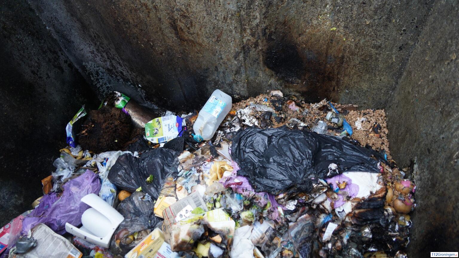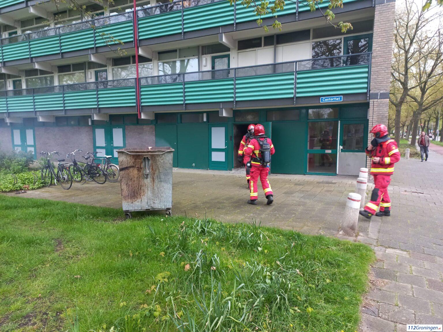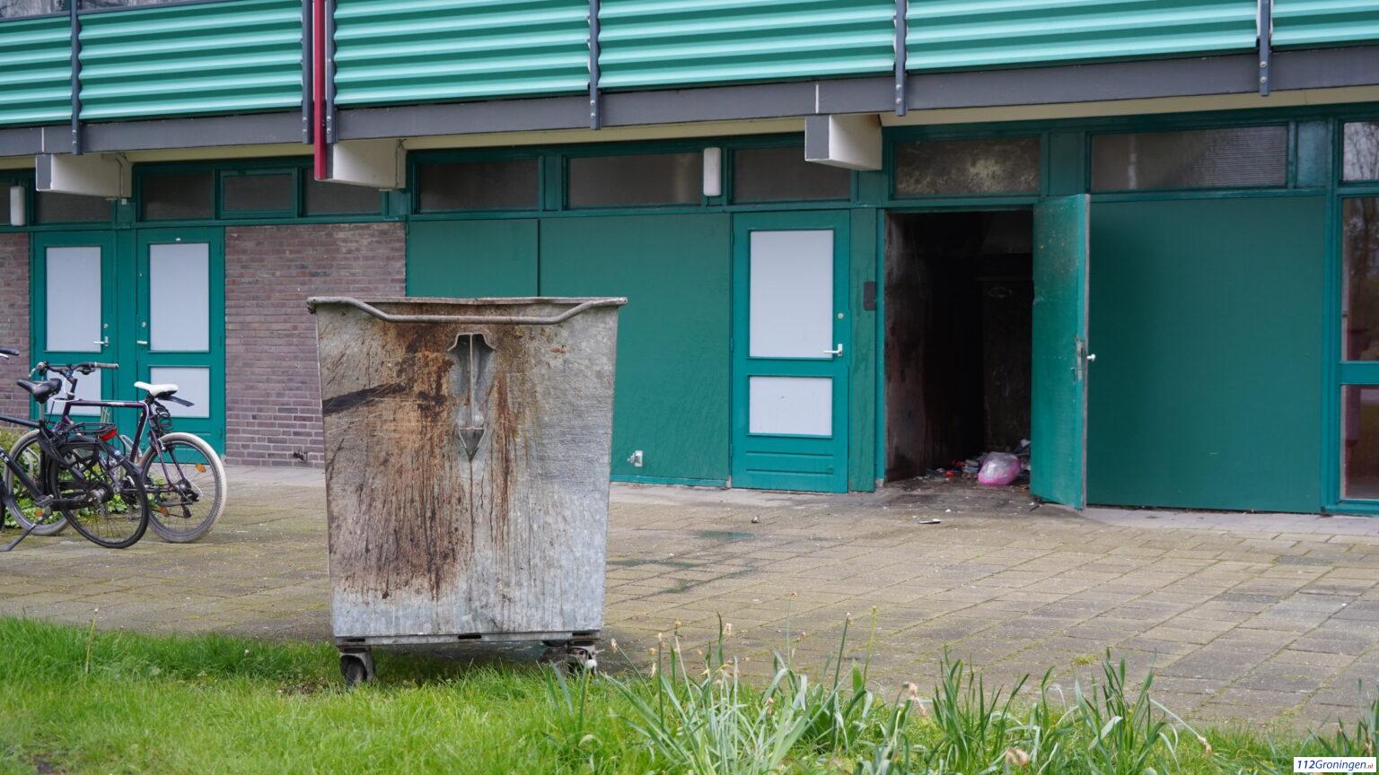 De brandende container stond in het afvalhok van de flat. De brandweer heeft de brand geblust.