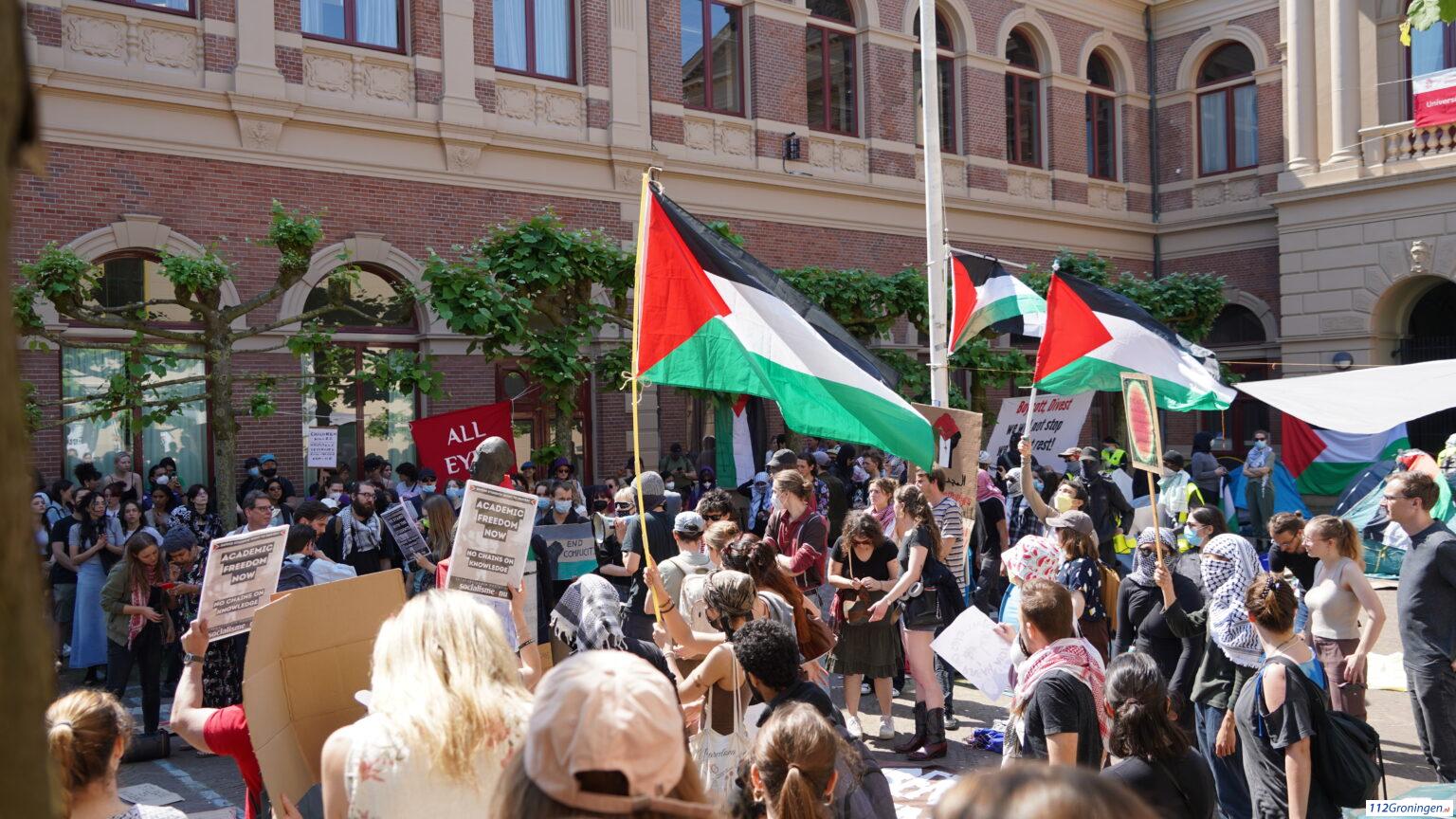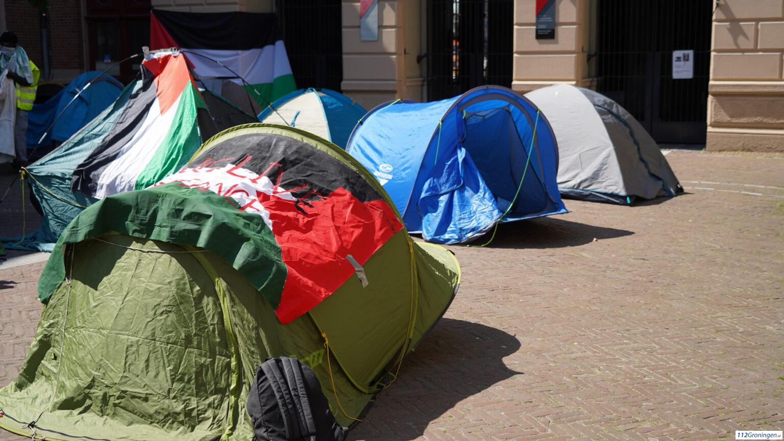 De demonstratie bij de RUG begon vorige week maandagochtend. Terwijl er een walk-out plaatsvond bij het Academiegebouw werden er tentjes opgezet op het plein voor het Harmoniegebouw. Die staan er inmiddels ruim een week. Een groep van ongeveer vijftig personen brengt er sindsdien de nacht door. De actievoerders mogen blijven overnachten op het pleintje, zolang er geen grote wanordelijkheden ontstaan en het verkeer niet wordt belemmerd, er niet wordt ingegrepen door politie of handhavers.