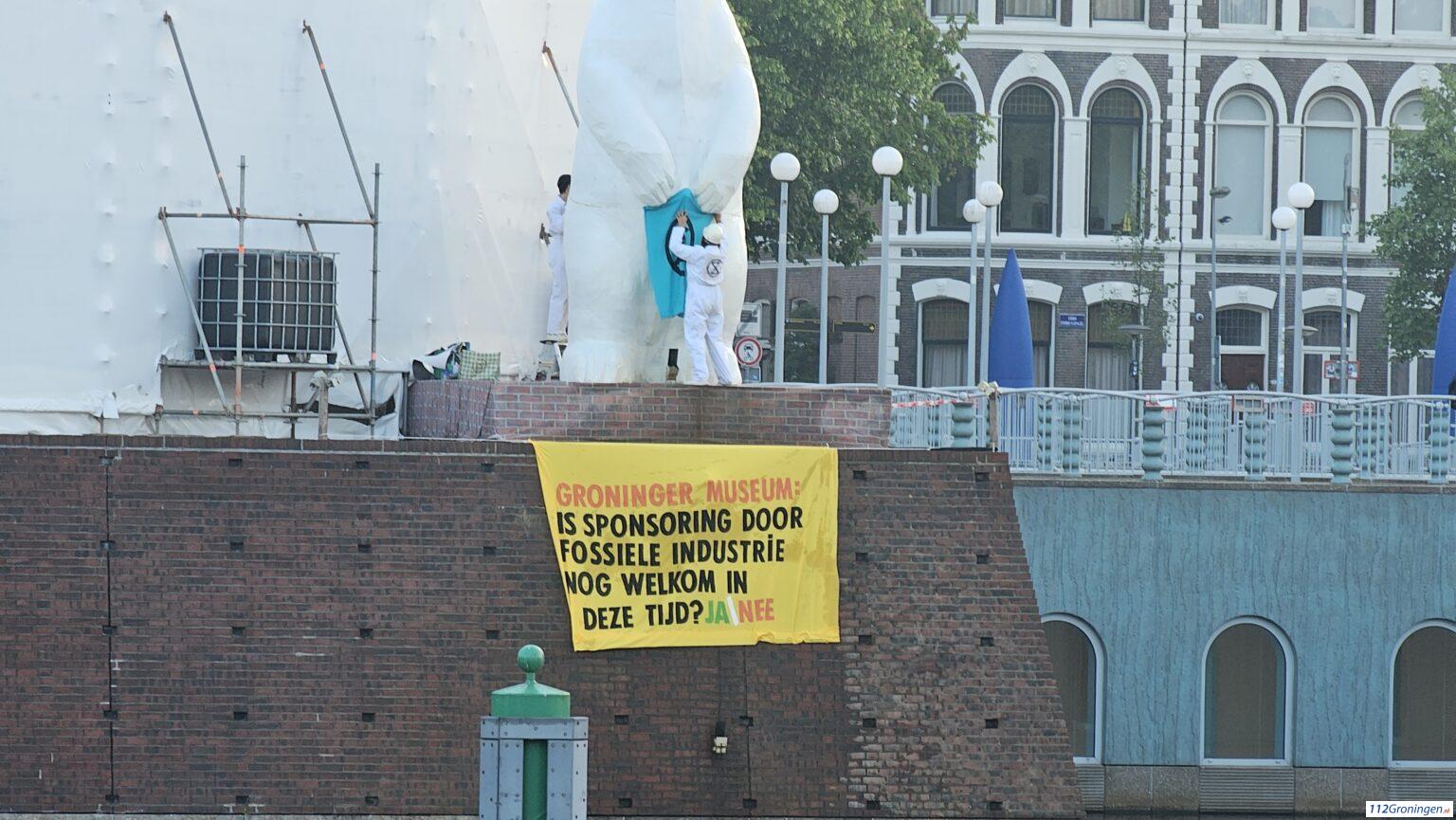 Actie Extinction Rebellion tegen Groninger Museum bij pissende ijsbeer