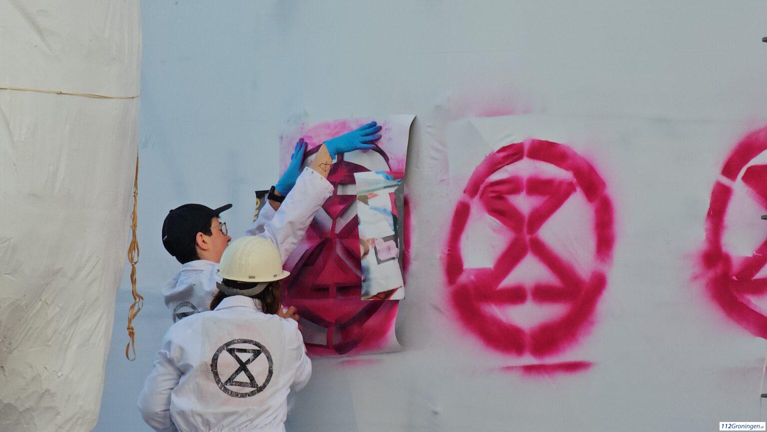 Groningen – De pissende ijsbeer bij het Groninger Museum was vrijdagochtend doelwit van een actie van Extinction Rebellion. De Groningse afdeling van de groep milieuactivisten hing posters op en spoot graffiti op een doek op een aantal steigers rond het museum.