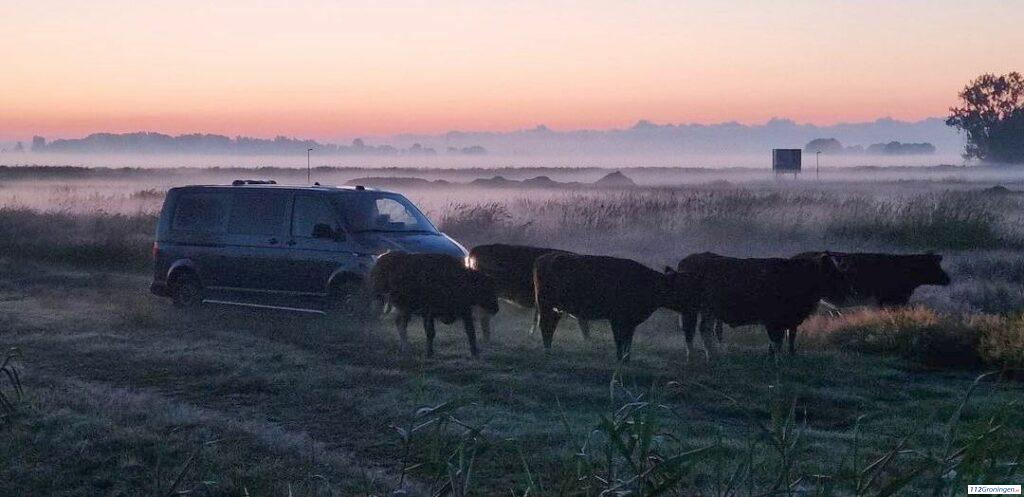 Meerstad – Een opvallend gezicht zondagavond in Meerstad. Vijf koeien en een stier hadden het wel gezien in hun weiland en besloten een ommetje te maken over de Vossenburglaan.