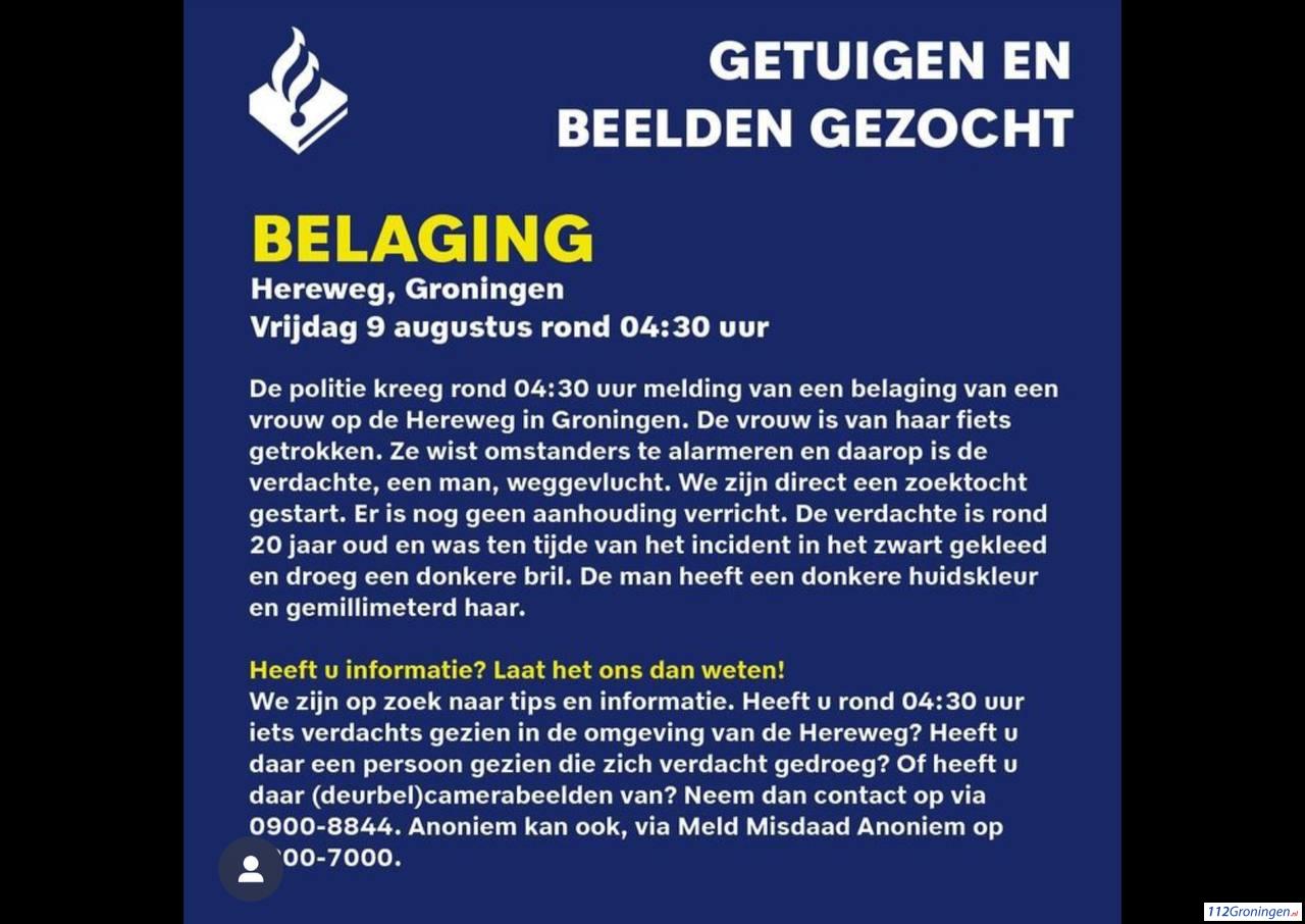 Vrouw ontkomt aan belager op Hereweg, grootschalige zoekactie naar verdachte