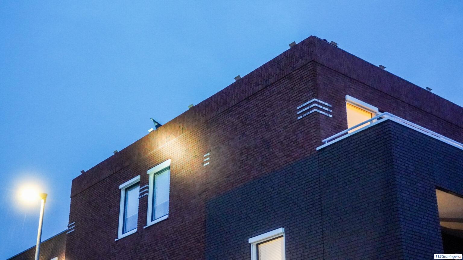 In Appingedam is een deel van een dakrand weggewaaid en aan de overkant van de straat terechtgekomen.