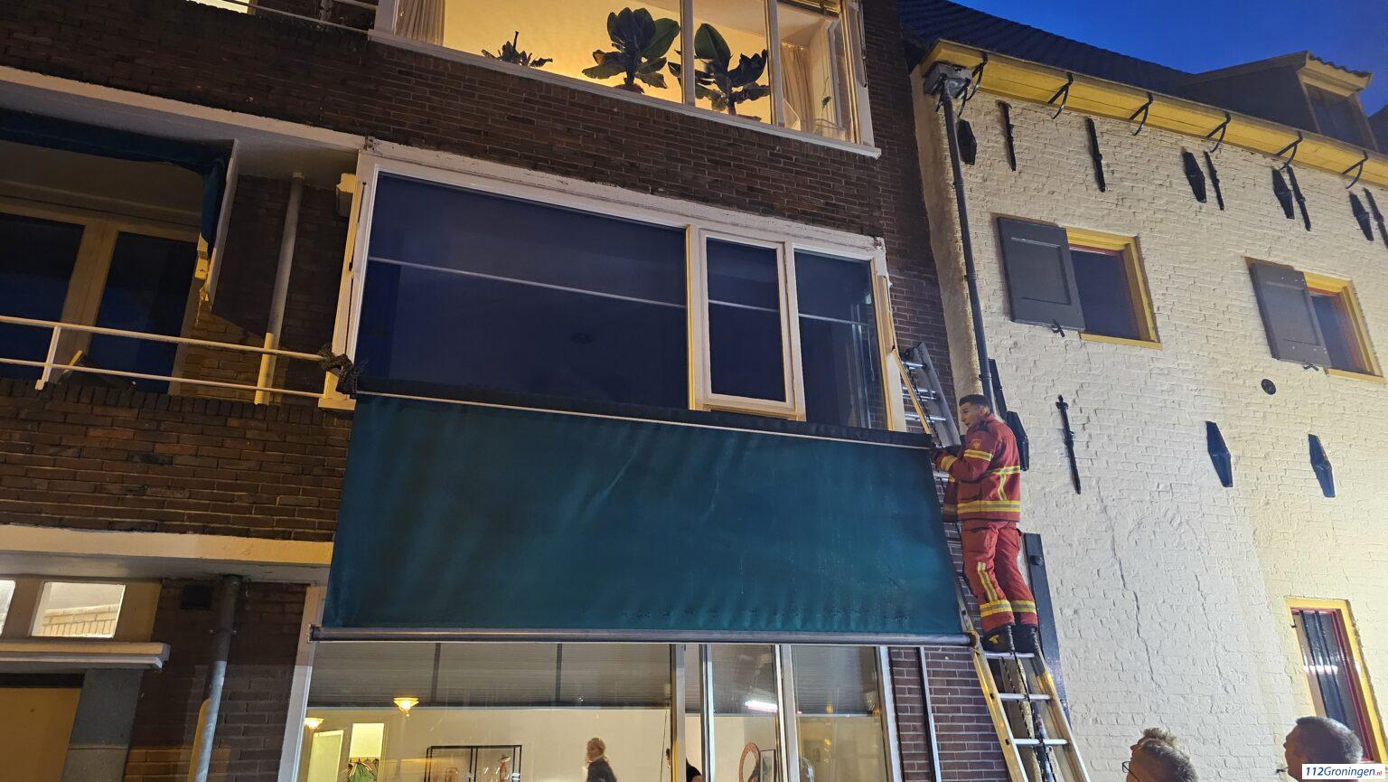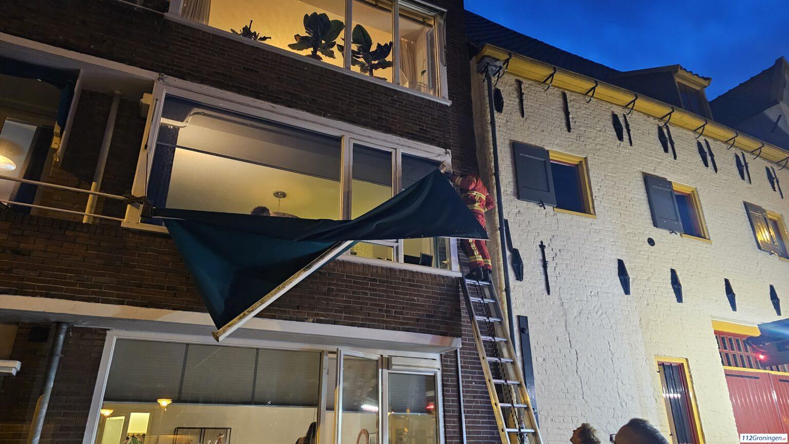 Aan de Noorderhaven in Groningen hing een zonnescherm los door de wind. De brandweer heeft het scherm verwijderd om te voorkomen dat het verder zou losraken en schade zou veroorzaken. Bij het verwijderen van het scherm heeft een brandweerman per ongeluk een kabel doorgeknipt, waardoor de stroom in de betreffende woning uitviel.