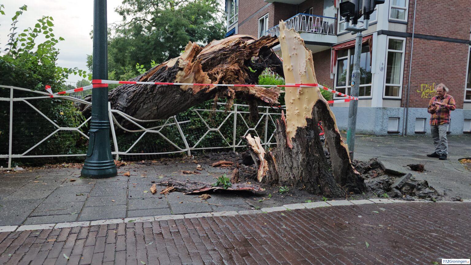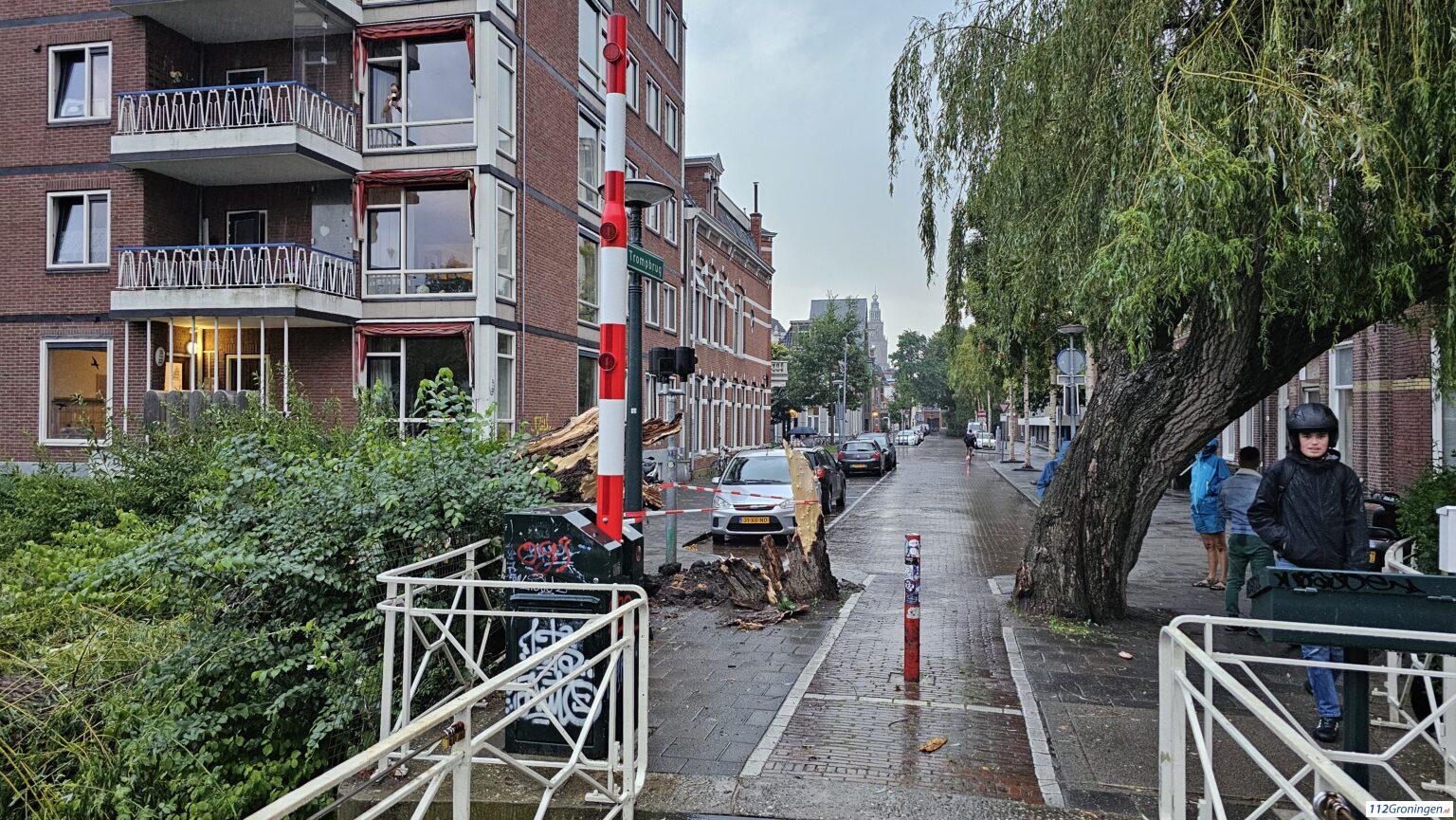 Bij de Trompbrug in Groningen is een van de iconische treurwilgen door de wind omgevallen, wat voor veel schade en overlast heeft gezorgd.