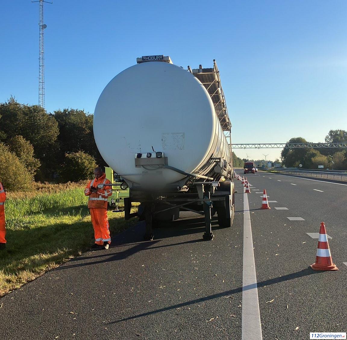 Bad Nieuweschans – Op de A7 bij de Duitse grens richting Winschoten heeft een vrachtwagen zijn oplegger donderdagmorgen geparkeerd.