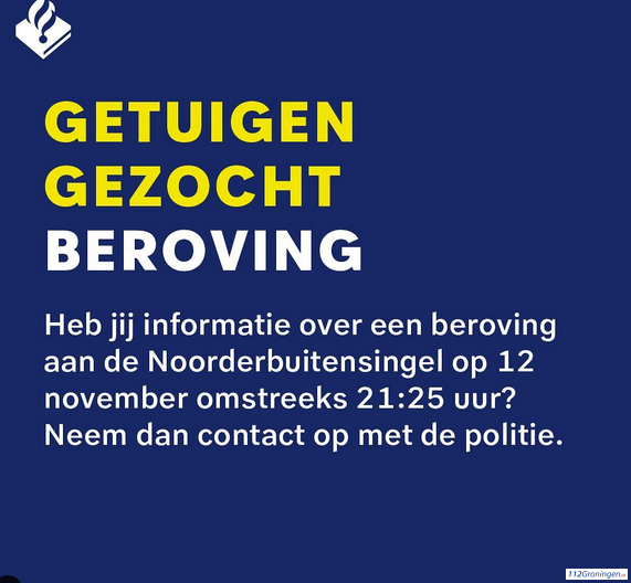 Heb jij deze beroving gezien? Heb je een groep van vier personen zien lopen in de buurt van de Noorderbuitensingel of later richting de Beren? Of heb je iemand horen praten over deze beroving? Neem dan contact op met de politie via 0900-8844. Liever anoniem? Bel dan Meld Misdaad Anoniem via 0800-7000.