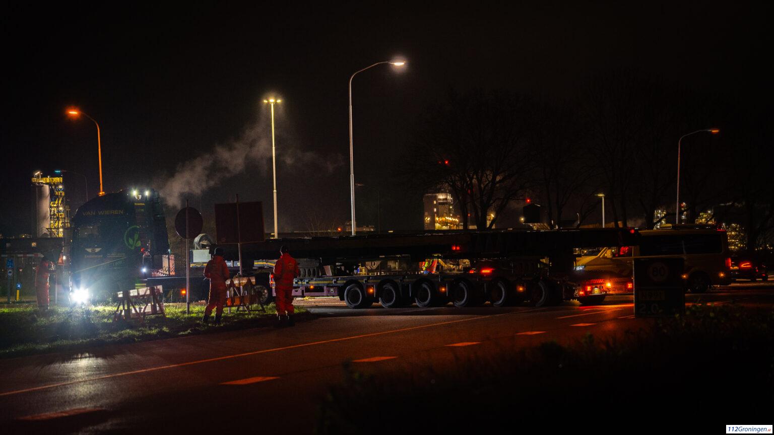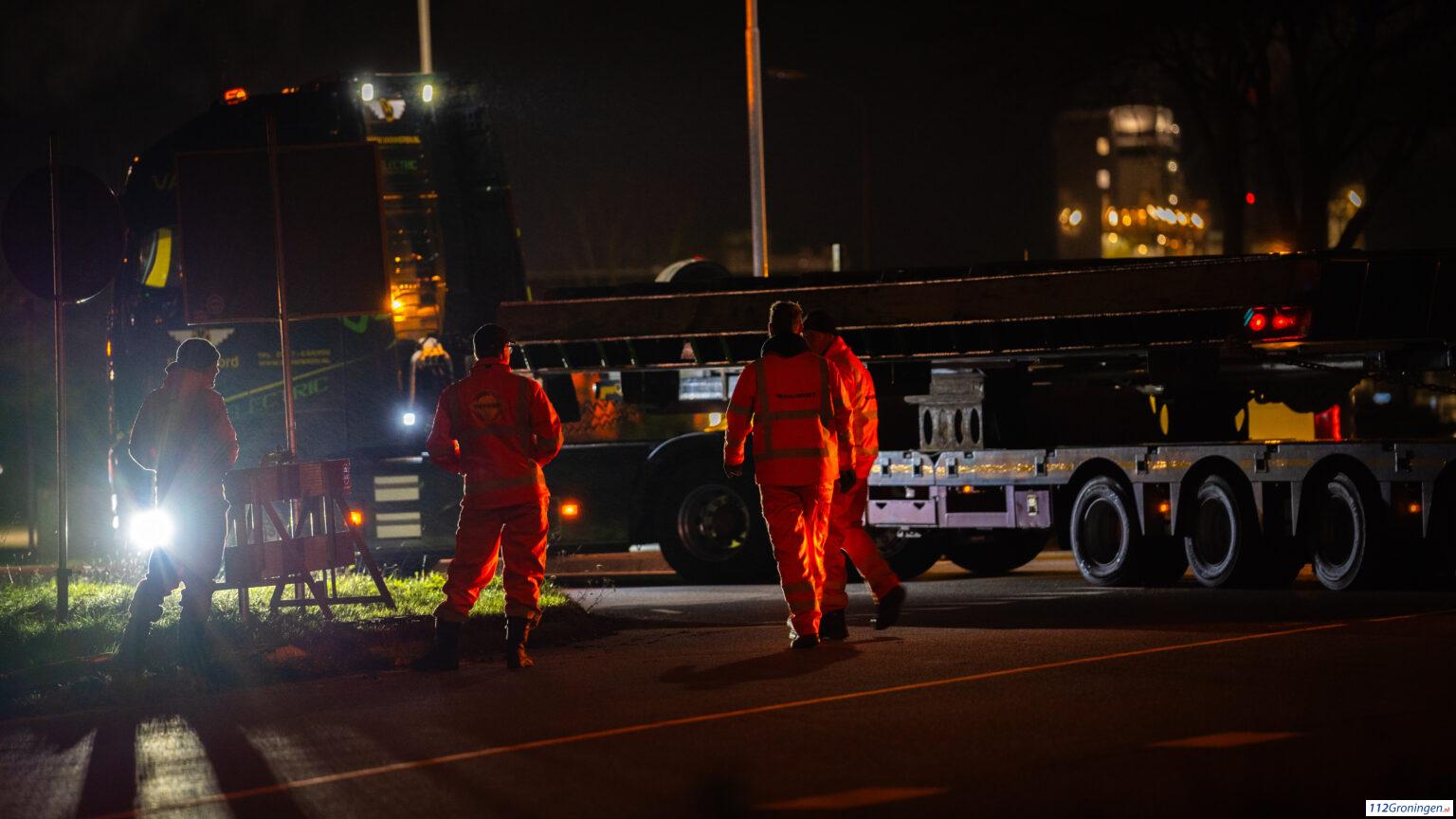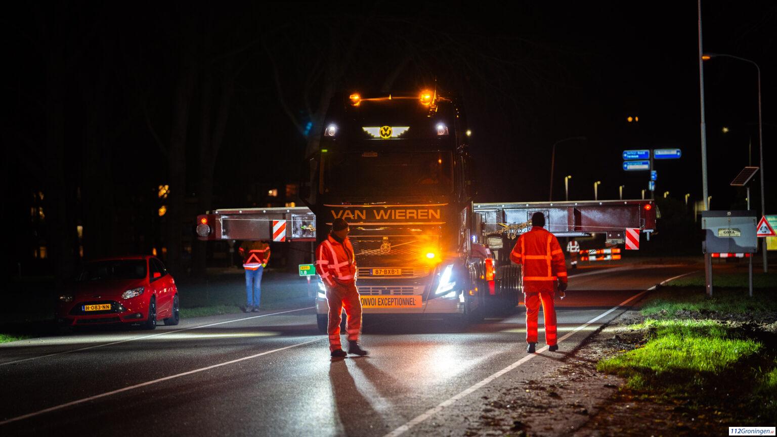 Update: De eerste sluisdeur voor de zeesluizen kwam rond 22:00 aan in Farmsum, dit ging niet zonder slag en stoot. De slagbomen van de burg moesten gedemonteerd worden, maar ook verschillende borden moesten schuin worden geplaatst.