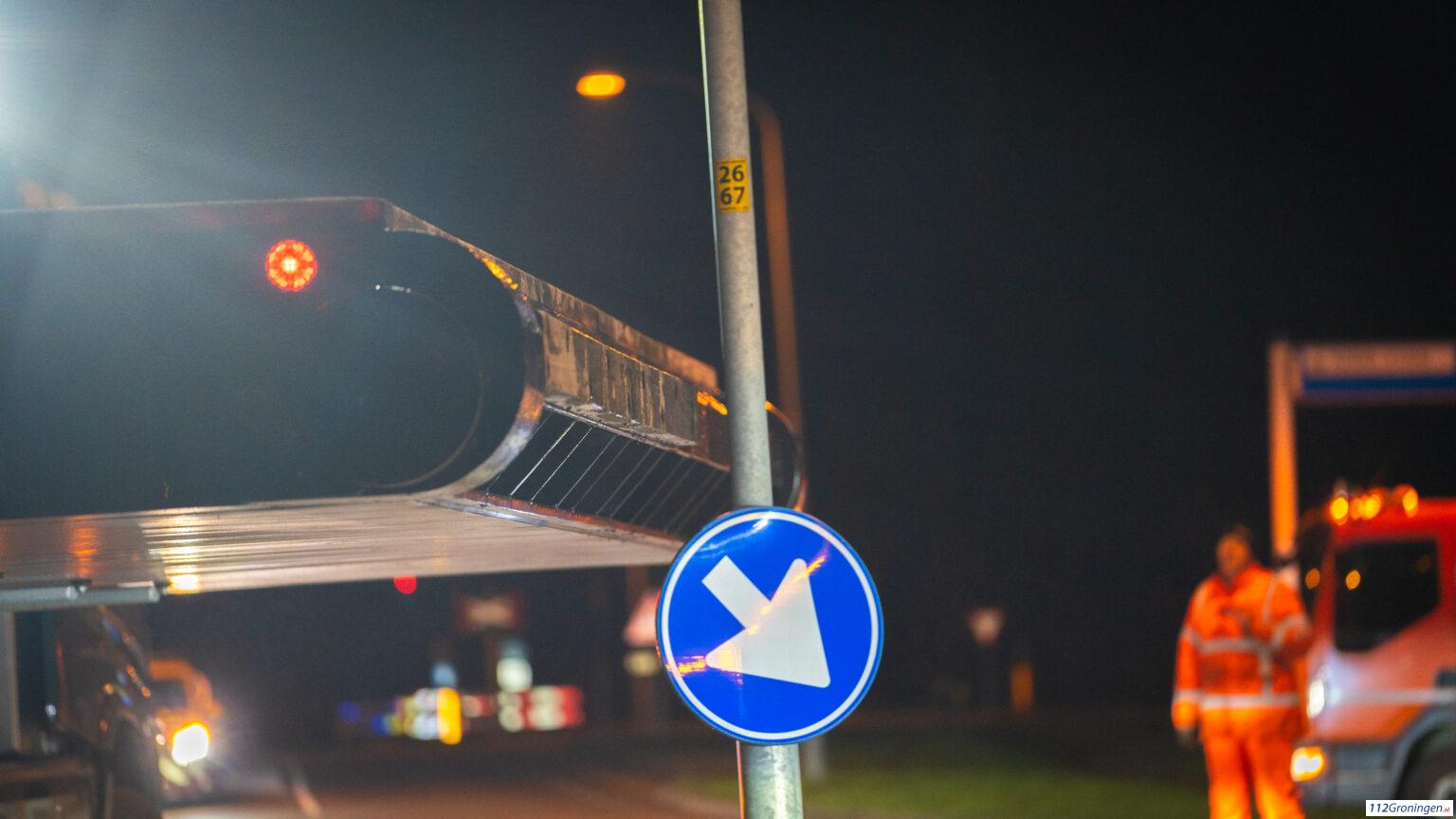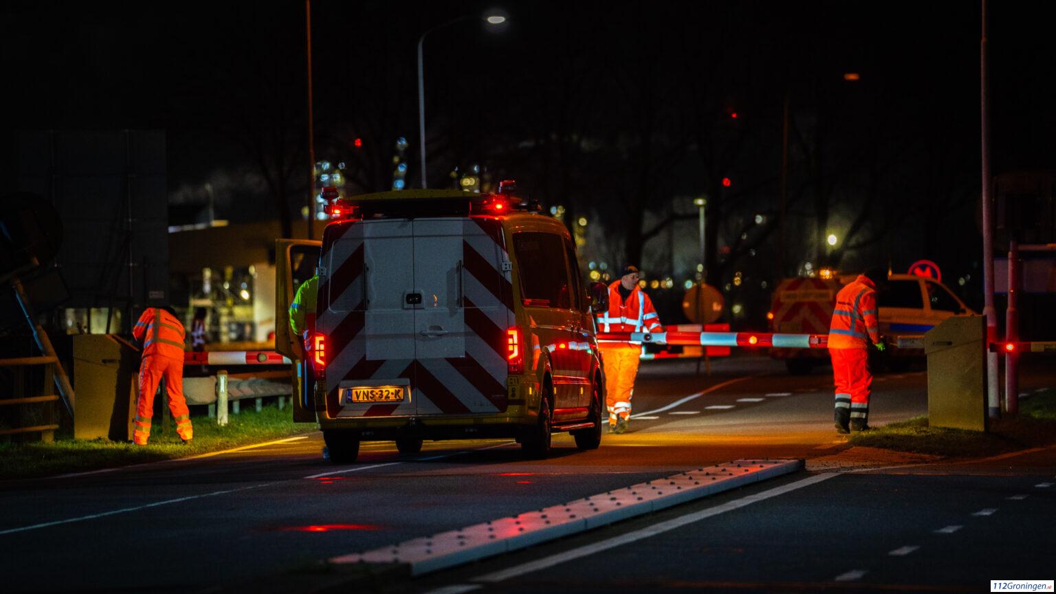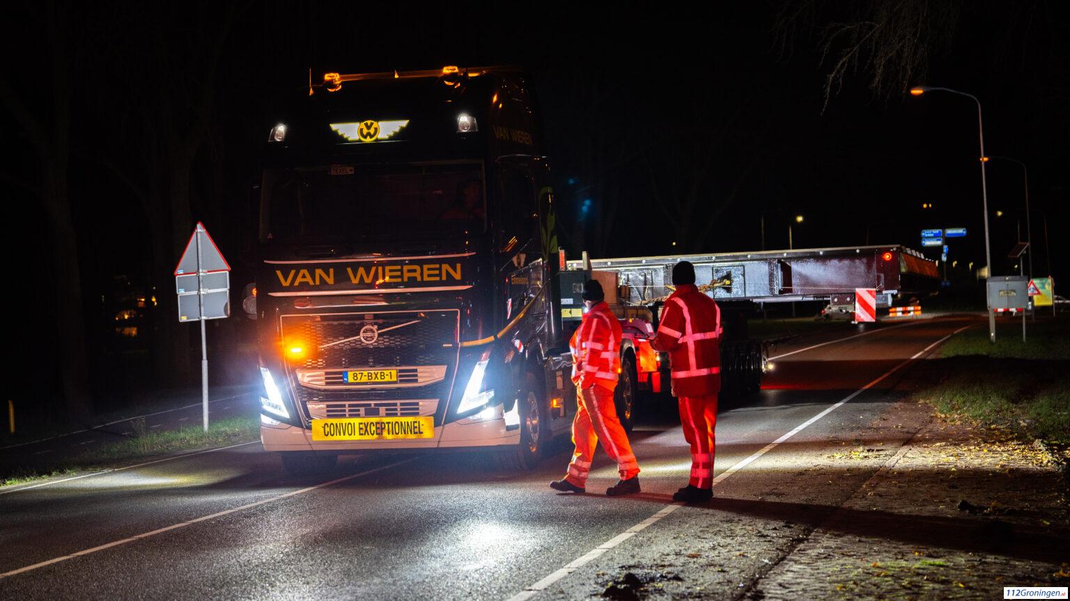 Update: De eerste sluisdeur voor de zeesluizen kwam rond 22:00 aan in Farmsum, dit ging niet zonder slag en stoot. De slagbomen van de burg moesten gedemonteerd worden, maar ook verschillende borden moesten schuin worden geplaatst.