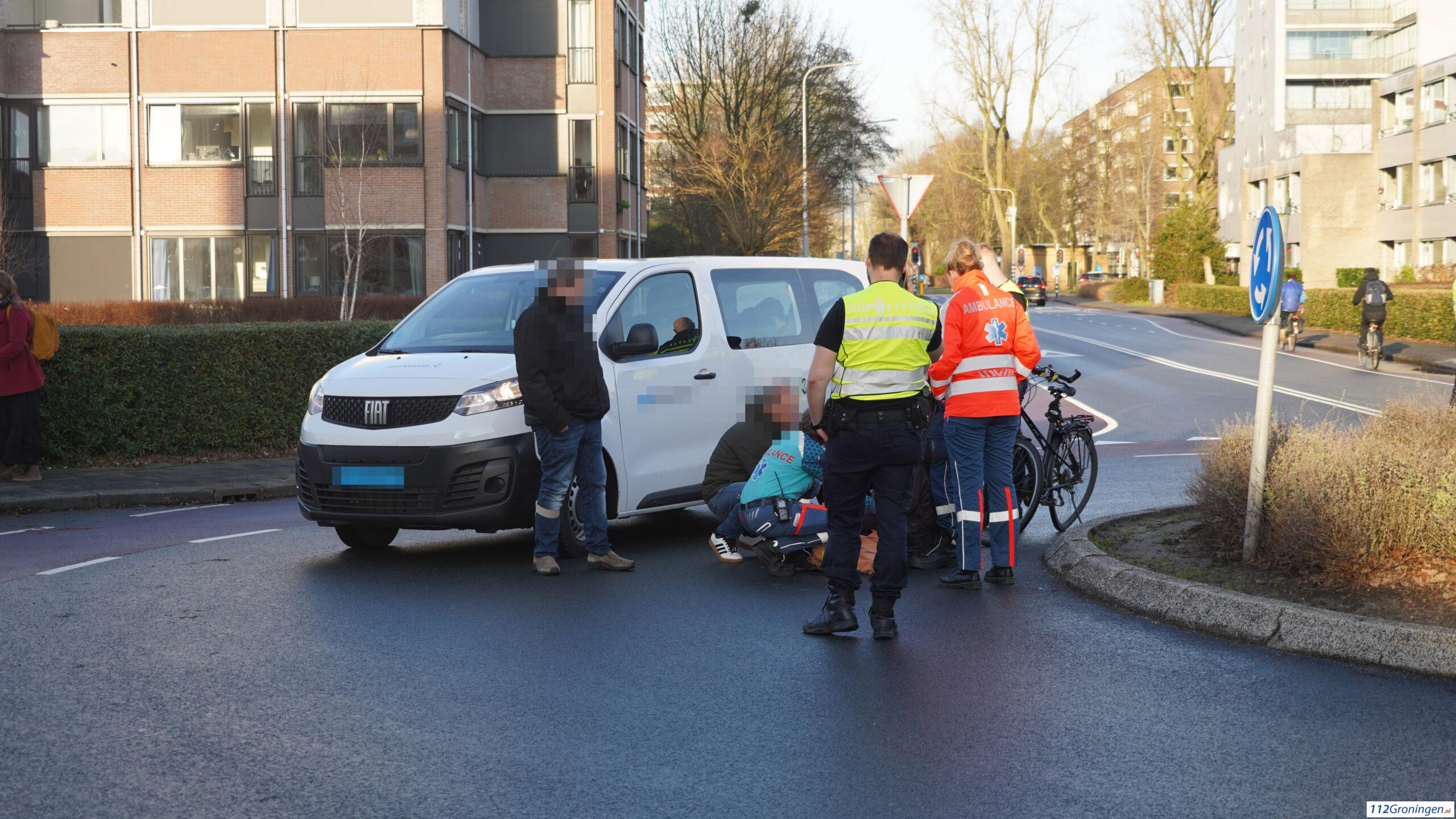 Groningen- Op de rotonde aan de S.O.J Palmelaan heeft maandagmiddag om 14:55 uur een aanrijding plaatsgevonden tussen een taxibusje en een fietser. Hierbij is de fietser gewond geraakt.